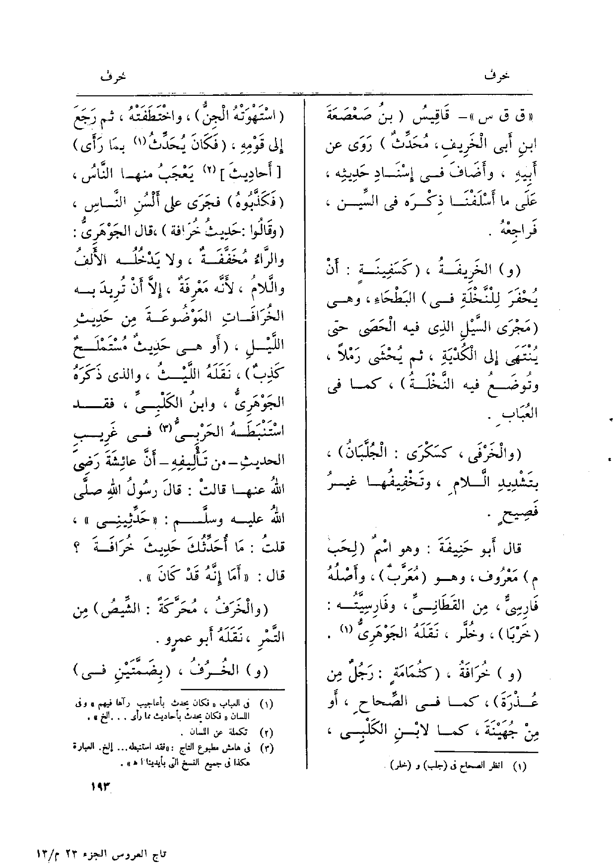 قَالَ أَبو حَنيفَةَ: وَهُوَ اسْمٌ لِحَب م مَعْرُوف، وَهُوَ مُعَرَّبٌ، وأَصْلُهُ فَارِسيٌّ، مِن القَطَانِيِّ، وفَارِسِيَّتُه: خَرْبَا، وخُلَّر، نَقَلَهُ الجَوْهَرِيُّ. وخُرَافَةُ، كثُمَامَةٍ: رَجُلٌ مِن عُذْرَةَ، كَمَا فِي الصِّحاحِ، أَو مِنْ جُهَيْنَةَ، كَمَا لابْنِ الكَلْبِي، اسْتَهْوَتْهُ الْجِنُّ، واخْتَطَفَتْهُ، ثمَّ رَجَعَ إِلى قَوْمِهِ، فَكَانَ يُحَدِّثُ بمَا) رَأَى أَحادِيثَ يَعْجَبُ مِنْهَا النَّاسُ، فَكَذَبُوهُ فجَرَى على أَلْسُنِ النَّاسِ، وقَالُوا: حَدِيثُ خُرَافة، قَالَ الجَوْهَرِيُّ: والرَّاءُ مُخَفَّفَةٌ، وَلَا يَدْخُلُه الأَلفُ والَّلامُ، لأَنَّه مَعْرِفَةٌ، إِلاَّ أَنْ تُرِيدَ بِهِ الخُرَافَاتِ المَوْضُوعَةَ مِن حَدِثِ اللَّيْلِ، أَو هِيَ حَدِيثٌ مُسْتَمْلَحٌ كَذِبٌ، نَقَلَهُ اللَّيْثُ، وَالَّذِي ذَكَرَهُ الجَوْهَرِيُّ، وابنُ الكَلْبِيِّ، فقد اسْتَنْبَطَهُ الحَرْبِيُّ فِي غَرِيبِ الحديثِ من تَأْلِيفِهِ أَنَّ عائِشَةَ رَضِيَ اللهُ عَنْهَا قالتْ: قالَ رَسُولُ اللهِ صلَّى اللهُ عَلَيهِ وسَلَّمَ: حَدِّثِينِي، قلتُ: مَا أُحَدِّثُكَ حَدِيثَ خُرَافَةَ قَالَ: أَمَا إِنَّهُ قَدْ كَانَ. والْخَرَفُ، مُحَرَّكَةً: الشِّيصُ مِن التَّمْرِ، نَقَلَهُ أَبو عمرٍ و. والخُرُفُ، بِضَمَّتَيْنِ فِي