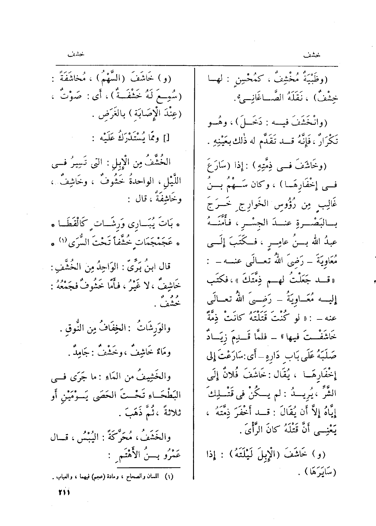 وظَبْيَةٌ مُخْشِفٌ، كمُحْسِنٍ: لَهَا خِشْفٌ، نَقَلَهُ الصَّاغَانِيُّ. وانْخَشَفَ فِيهِ: دَخَلَ، وهُو تَكْرَارٌ، فإِنَّهُ قد تَقَدَّم لَهُ ذَلِك بغَيْنِهِ. وخَاشَفَ فِي ذِمَّتِهِ: إِذا سَارَعَ فِي إِخْفَارِهَا، وَكَانَ سَهْمُ بنُ غَالِبٍ مِن رُؤُوسِ الخَوارِجِ خَرَجَ بالبَصْرةِ عندَ الجِسْرِ، فأَمَّنَهُ عبدُ الله بنُ عامِرٍ، فكَتَبَ إِلَى مُعَاوِيَةَ رَضِيَ اللهُ تعالَى عَنهُ: قد جَعَلْتُ لَهُم ذِمَّتَكَ، فكتَب إِليه مُعَاوِيَةُ رَضِيَ اللهُ تعالَى عَنهُ: لَو كُنْتَ قَتَلْتَهُ كانَتْ ذِمَّةً خَاشَفْتَ فِيهَا فلمَّا قَدِمَ زِيَادٌ صَلَبَهُ عَلَى بَابِ دَارِهِ أَي: سَارَعْتَ إِلى إِخْفَارِهَا، يُقَال: خَاشَفَ فُلانٌ إِلَى الشَّرِّ، يُرِيدُ: لم يكُنْ فِي قَتْلِكَ إِيَّاهُ إِلاَّ أَن يُقَالَ: قد أَخْفَرَ ذِمَّتَهُ، يَعْنِي أَنَّ قَتْلَهُ كانَ الرَّأْيَ.