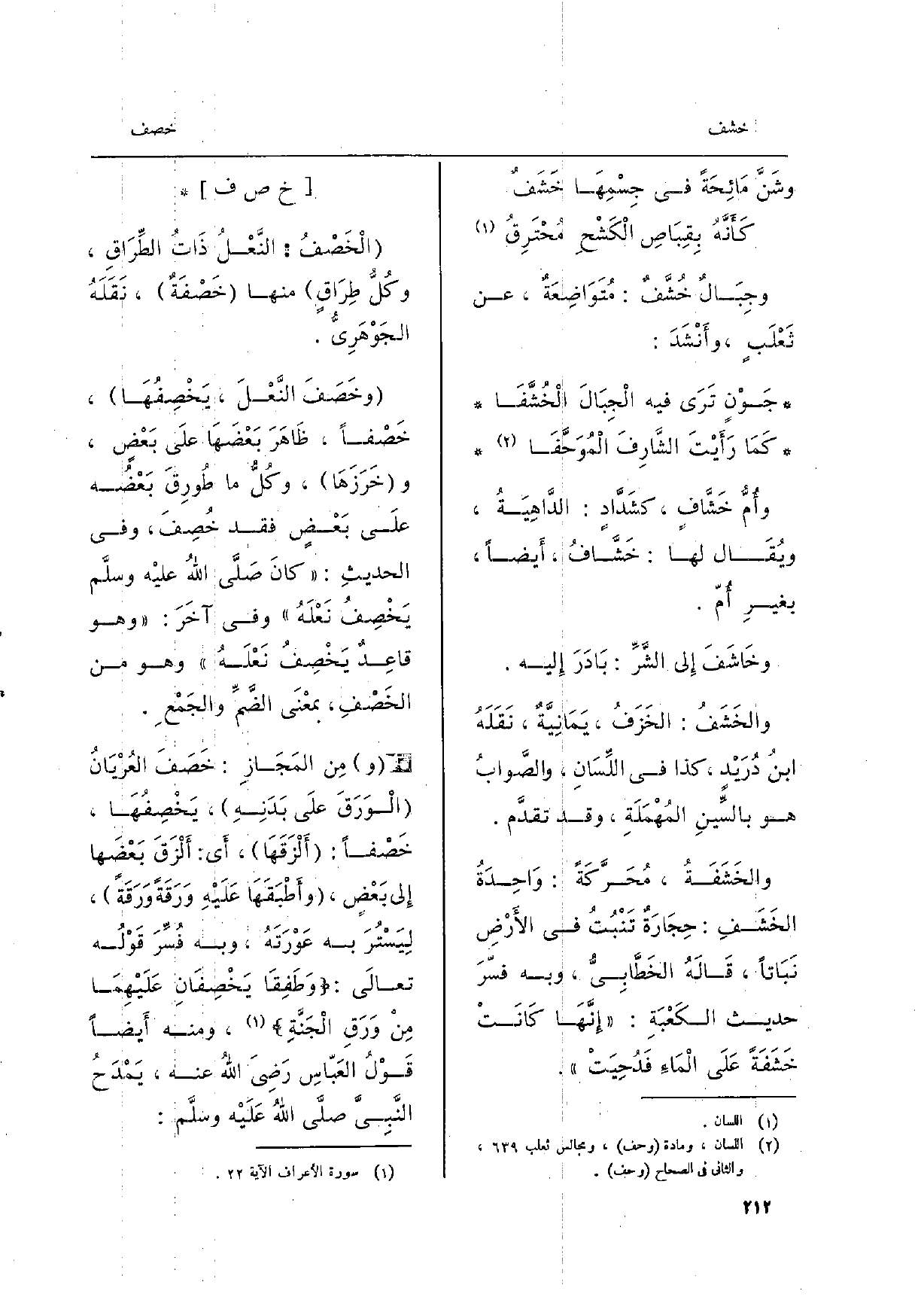 ) الْخَصْفُ: النَّعْلُ ذَاتُ الطِّرَاقِ، وكُلُّ طِرَاقٍ مِنْهَا خَصْفَةٌ، نَقَلَهُ الجَوْهَرِيُّ. وخَصَفَ النَّعْلَ، يَخْصِفُهَا، خَصْفاً، ظَاهَرَ بَعْضَهَا علَى بَعْضٍ، وخَرَزَهَا، وكُلُّ مَا طُورِقَ بَعْضُه علَى بَعْضٍ فقد خُصِفَ، وَفِي الحديثِ: كانَ صلَّى اللهُ عَلَيهِ وسَلَّمَ يَخْصِفُ نَعْلَهُ وَفِي آخَرَ: وَهُوَ قاعِدٌ يَخْصِفُ نَعْلَهُ وَهُوَ من الخَصْفِ، بمعْنَى الضَّمِّ والجَمْعِ. ومِن المَجَازِ: خَصَفَ العُرْيَانُ الْوَرَقَ علَى بَدَنِهِ، يَخْصِفُهَا، خَصْفاً: أَلْزَقَهَا، أَي: أَلْزَقَ بَعْضَها إِلى بَعْضٍ، وأَطْبَقَهَا عَلَيْهِ وَرَقَةً وَرَقَةً، لِيَسْتُرَ بِهِ عَوْرَتَهُ، وَبِه فُسِّرَ قَوْلُه تعالَى: وَطَفِقَا يَخْصِفَانِ عَلَيْهِمَا مِنْ وَرَقِ الْجَنَّةِ، وَمِنْه أَيضاً قَوْلُ العَبَّاسِ رَضِيَ اللهُ عَنهُ، يَمْدَحُ النَّبِيَّ صلَّى اللهُ عَلَيهِ وسَلَّمَ:
