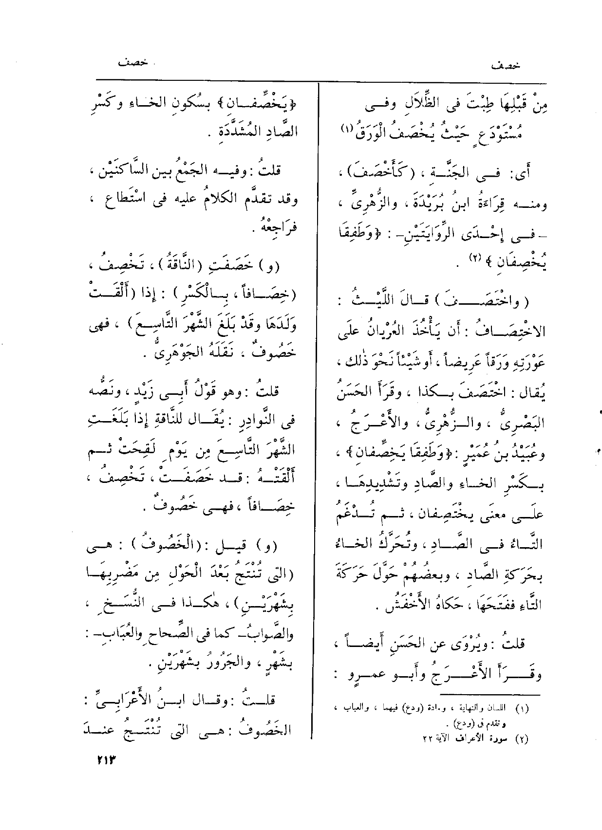 قلتُ: ويُرْوَى عَن الحَسَنِ أَيضاً، وقَرَأَ الأَعْرَجُ وأَبو عمرٍ و: يَخْصِّفانِ بسُكونِ الخاءِ وكَسْرِ الصَّادِ المُشَدَّدَةِ.