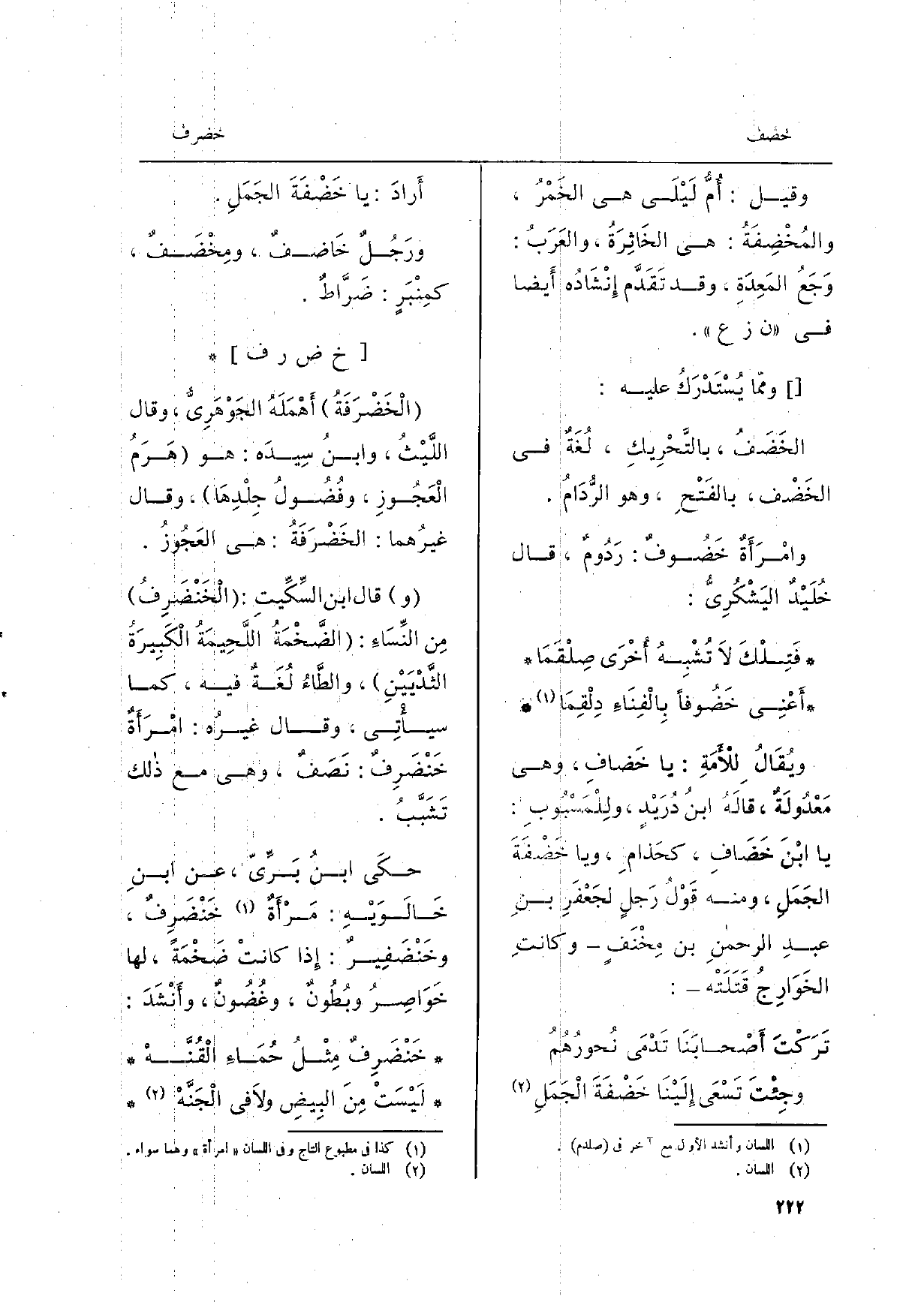 ) الْخَضْرَفَةُ أَهْمَلَهُ الجَوْهَرِيُّ، وَقَالَ اللَّيْثُ، وابنُ سِيدَه: هُوَ هَرَمُ الْعَجُوزِ، وفُضُولُ جِلْدِهَا، وَقَالَ غيرُهما: الخَضْرَفَةُ: هِيَ العَجُوزُ. وَقَالَ ابْن السِّكِّيتِ: الْخَنْضَرِفُ مِن النِّسَاءِ: الضَّخْمَةُ اللَّحِيمَةُ الْكَبِيرَةُ الثَّدْيَيْنِ، والطَّاءُ لُغَةٌ فِيهِ، كَمَا سيأْتِي، وَقَالَ غيرُه: امْرَأَةٌ خَنْضَرِفٌ: نَصَفٌ، وَهِي مَعَ ذَلِك تَشَبَّبُ. حكَى ابنُ بَرِّيّ، عَن ابنِ خَالَوَيْهِ: مَرْأَةٌ خَنْضَرِفٌ، وخَنْضَفِيرٌ: إِذا كانتْ ضَخْمَةً، لَهَا خَوَاصِرُ وبُطُونٌ، وغُضُونٌ، وأَنْشَدَ: خَنْضَرِفٌ مِثْلُ حُمَاءِ الْقُنَّهْ لَيْسَتْ مِنَ البِيضِ ولاَ فِي الْجَنَّهْ
