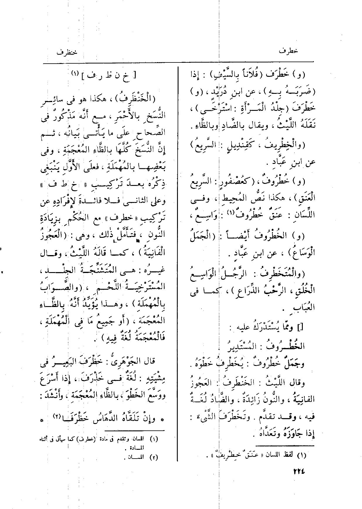 ) الْخَنْظَرِفُ، هَكَذَا هُوَ فِي سائِرِ النُّسَخِ بالأَحْمَرِ، مَعَ أَنَّه مَذْكُورٌ فِي الصِّحاحِ علَى مَا يَأْتي بَيانُه، ثمَّ إِنَّ النُّسَخَ كُلَّهَا بالظَّاءِ المُعْجَمَةِ، وَفِي بَعْضِها بالمُهْمَلَةِ، فعلَى الأَوَّلِ يَنْبَغِي ذِكْرُه بعدَ تَرْكِيبِ خَ ط ف وعَلى الثَّانِي فَلَا فائدةَ لإِفْرَادِهِ عَن تَرْكِيبِ خطرف مَعَ الحُكْمِ بزِيَادَةِ النُّونِ، فتَأَمَّلْ ذَلِك، وَهِي: الْعَجُوزُ الْفَانِيَةُ، كَمَا قَالَهُ اللَّيْثُ، وَقَالَ غيرُه: هِيَ المُتَشَنِّجَةُ الجِلْدِ، المُسْتَرْخِيَةُ اللَّحْمِ، والصَّوابُ بِالْمُهْمَلَةِ، وَهَذَا يُؤَيِّدُ أَنَّهُ بِالظَّاءِ المُعْجَمَةِ، أَو جَمِيعُ مَا فِي الْمُهْمَلَةِ، فَالْمُعْجَمَةُ لُغَةٌ فِيهِ.