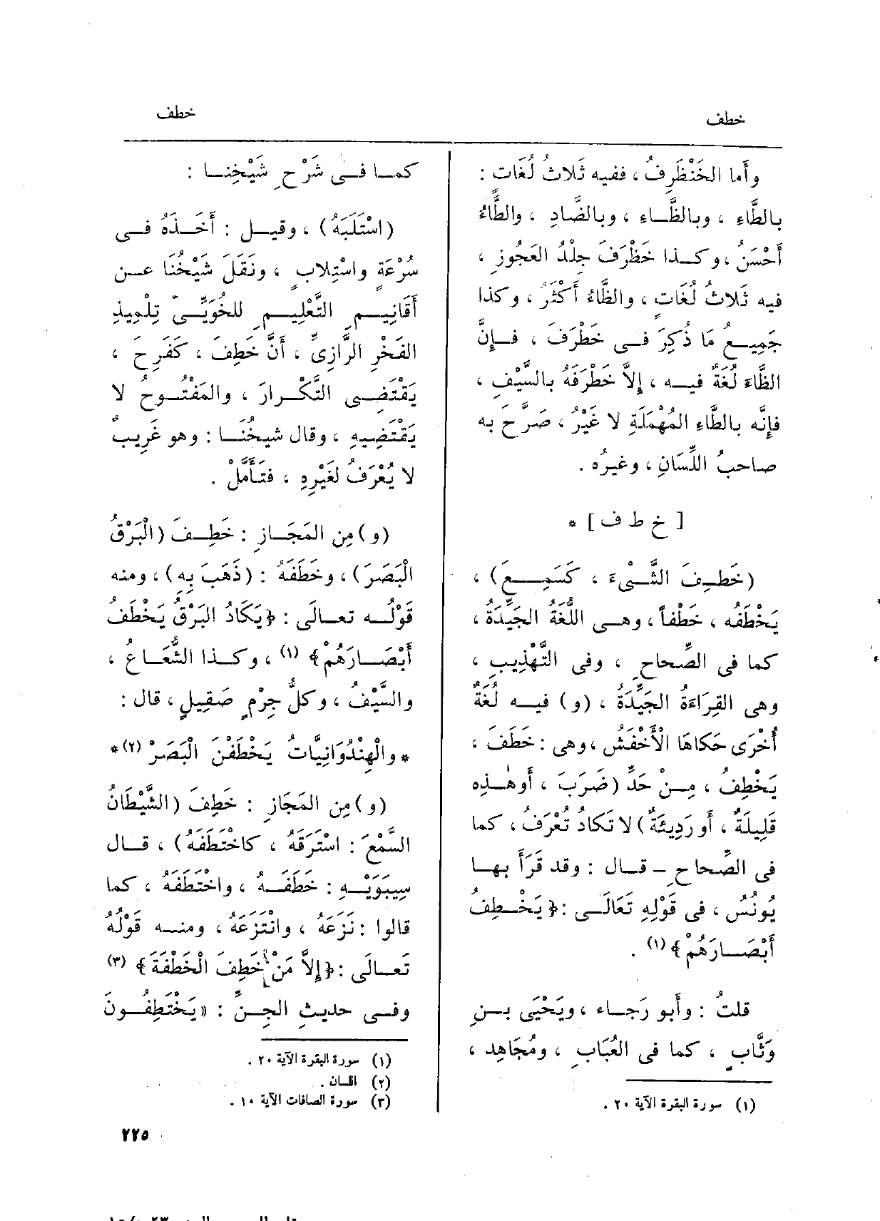 قلتُ: وأَبو رَجاء، ويَحْيَى بنِ وَثَّابٍ، كَمَا فِي العُبَابِ، ومُجَاهِد، كَمَا فِي شَرْحِ شَيْخِنا: اسْتَلَبَهُ، وَقيل: أَخَذَهُ فِي سُرْعَةٍ واسْتِلابٍ، ونَقَلَ شَيْخُنَا عَن أَقَانِيمِ التَّعْلِيمِ للخُوَيِّيّ تِلْمِيذِ الفَخْرِ الرَّازِيِّ، أَنَّ خَطِفَ، كَفَرِحَ، يَقْتَضِي التَّكْرارَ، والمَفْتُوحُ لَا يَقْتَضِيهِ، وَقَالَ شيخُنَا: وَهُوَ غَرِيبٌ لَا يُعْرَفُ لغَيْرِهِ، فَتأَمَّلْ. ومِن المَجَازِ: خَطِفَ الْبَرْقُ الْبَصَرَ، وخَطَفَهُ: ذَهَبَ بِهِ، وَمِنْه قَوْلُه تعالَى: يَكَادُ البَرْقُ يَخْطَفُ أَبْصَارَهُمْ، وَكَذَا الشُّعَاعُ، والسَّيْفُ، وكلُّ جِرْمٍ صَقِيلٍ، قَالَ: والهِندُوَانِيَّاتُ يَخْطَفْنَ الْبَصَرْ ومِن المَجَازِ: خَطِفَ الشَّيْطَانُ السَّمْعَ: اسْتَرَقَهُ، كاخْتَطَفَهُ، قَالَ سِيبَوَيْهِ: خَطَفَهُ، واخْتَطَفَهُ، كَمَا قَالُوا: نَزَعَهُ، وانْتَزَعَهُ، وَمِنْه قَوْلُهُ تَعالَى: إِلاَّ مَنْ خَطِفَ الْخَطْفَةَ وَفِي حديثِ الجِنِّ: يَخْتَطِفُونَ)