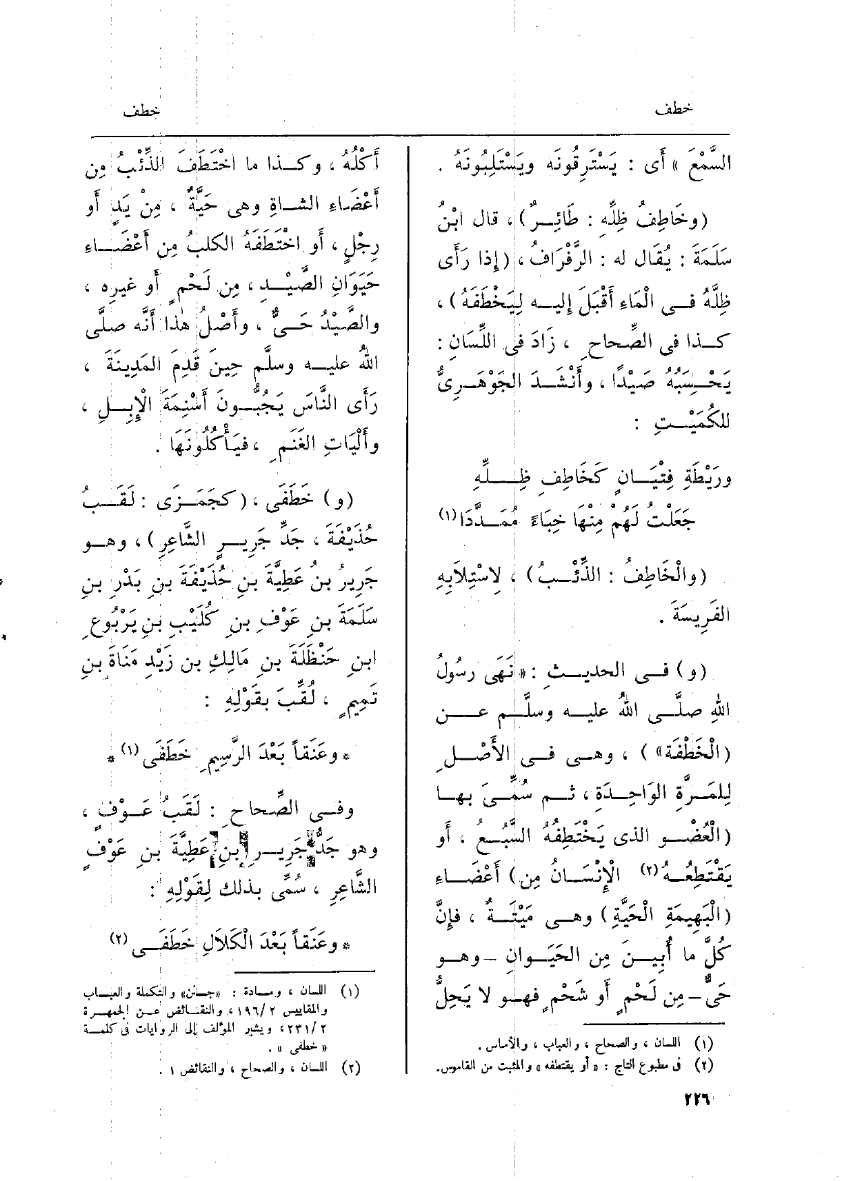 والْخَاطِفُ: الذِّئْبُ، لاِسْتِلاَبِهِ الفَرِيسَةَ. وَفِي الحديثِ: نَهَى رسُولُ اللهِ صلَّى اللهُ عَلَيْهِ وسلَّم عَن الْخَطْفَة، وَهِي فِي الأَصْلِ لِلمَرَّةِ الوَاحِدَةِ، ثمَّ سُمِّيَ بهَا الْعُضْو الَّذِي يَخْتَطِفُهُ السَّبُعُ، أَو يَقْتَطِعُهُ الإِنْسَانُ مِن أَعْضَاءِ الْبَهِيمَةِ الْحَيَّةِ وَهِي مَيْتَةٌ، فإِنَّ كُلَّ مَا أُبِينَ مِن الحَيَوانِ وَهُوَ حَيٌّ مِن لَحْمٍ أَو شَحْمٍ فَهُوَ لَا يَحِلُّ أَكْلُهُ، وَكَذَا مَا اخْتَطَفَ الذِّئْبُ مِن أَعْضَاءِ الشاةِ وَهِي حَيَّةٌ، مِنْ يَدٍ أَو رِجْلٍ، أَو اخْتَطَفَهُ الكلبُ مِن أَعْضَاءِ حَيَوَانِ الصَّيْدِ، مِن لَحْمٍ أَو غيرِه، والصَّيْدُ حَيٌّ، وأَصْلُ هَذَا أَنَّه صلَّى اللهُ عَلَيْهِ وسلَّم حِينَ قَدِمَ المَدِينَةَ، رَأَى النَّاسَ يَجُبُّونَ أَسْنِمَةَ الإِبِلِ، وأَلْيَاتِ الغَنَمِ، فيَأْكُلُونَهَا. خَطَفَى، كجَمَزَى: لَقَبُ حُذَيْفَةَ، جَدِّ جَرِيرٍ الشَّاعِرِ، وَهُوَ جَرِيرُ بنُ عَطِيَّةَ بنِ حُذَيْفَةَ بنِ بَدْرِ بنِ سَلَمَةَ بنِ عَوْفِ بنِ كُلَيْبِ بنِ يَرْبُوعِ ابنِ حَنْظَلَةَ بنِ مَالِكِ بن زَيْدِ مَنَاةَ بنِ تَمِيمٍ، لُقِّبَ بقَوْلِهِ: وعَنَقاً بَعْدَ الرَّسِيمِ خَطَفَى وَفِي الصِّحاحِ: لَقَبْ عَوْفٍ، وَهُوَ جَدُّ جَرِيرِ بنِ عَطِيَّةَ بنِ عَوْفٍ الشَّاعِرِ، سُمِّى بذلك لِقَوْلِهِ: وعَنَقاً بَعْدَ الْكَلاَلِ خَطَفَى