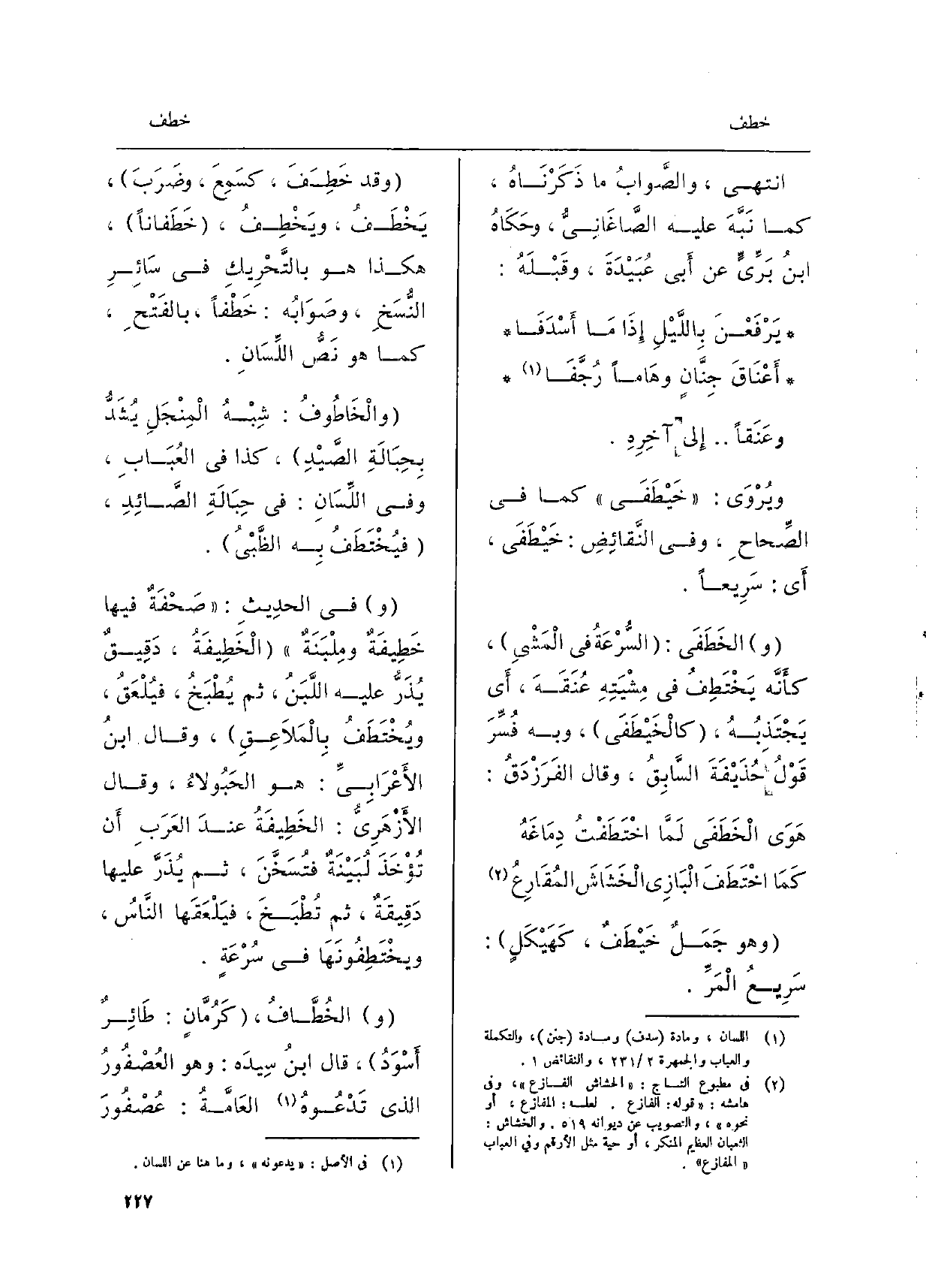 انْتهى، والصَّوابُ مَا ذَكَرْنَاهُ، كَمَا نَبَّهَ عَلَيْهِ الصَّاغَانِيُّ، وحَكَاهُ ابنُ بَرِّيٍّ عَن أَبي عُبَيْدَةَ، وقَبْلَهُ: يَرْفَعْنَ بِاللَّيْلِ إِذَا مَا أَسْدَفَا أَعْنَاقَ جِنَّانٍ وهَاماً رُجَّفَا وعَنَقاً. . إِلى آخِرِهِ. ويُرْوَى: خَيْطَفَى كَمَا فِي الصِّحاحِ، وَفِي النَّقائِضِ: خَيْطَفَى، أَي: سَرِيعاً.