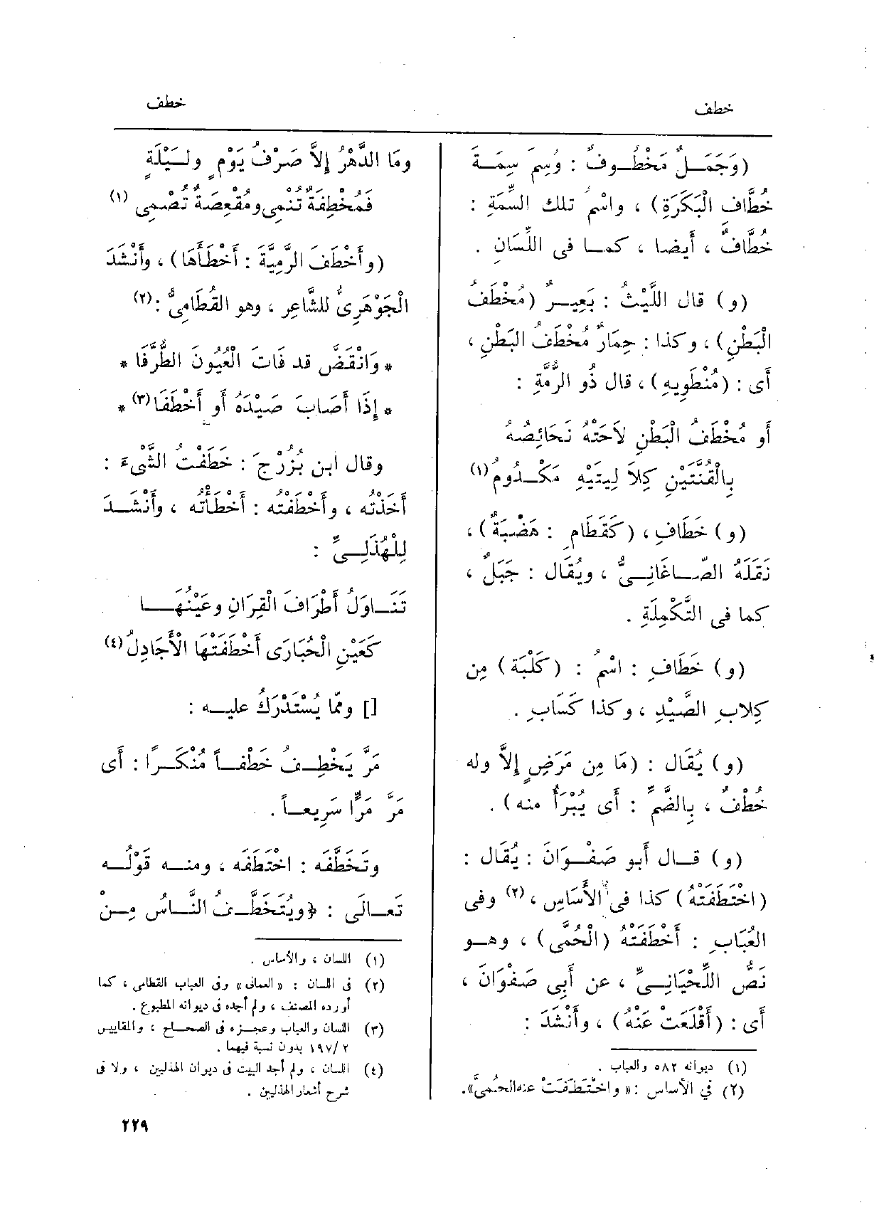 وأَخْطَفَ الرَّمِيَّةَ: أَخْطَأَهَا، وأَنْشَدَ الْجَوْهَرِيُّ للشَّاعِر، وَهُوَ القُطَامِيُّ: وَانْقَضَّ قد فَاتَ الْعُيُونَ الطُّرَّفَا إِذَا أَصَابَ صَيْدَهُ أَو أَخْطَفَا وَقَالَ ابْن بُزُرْجَ: خَطَفْتُ الشَّيْءَ: أَخَذْتُه، وأَخْطَفْتُه: أَخْطَأْتُه، وأَنْشَدَ لِلْهُذَلِيِّ: