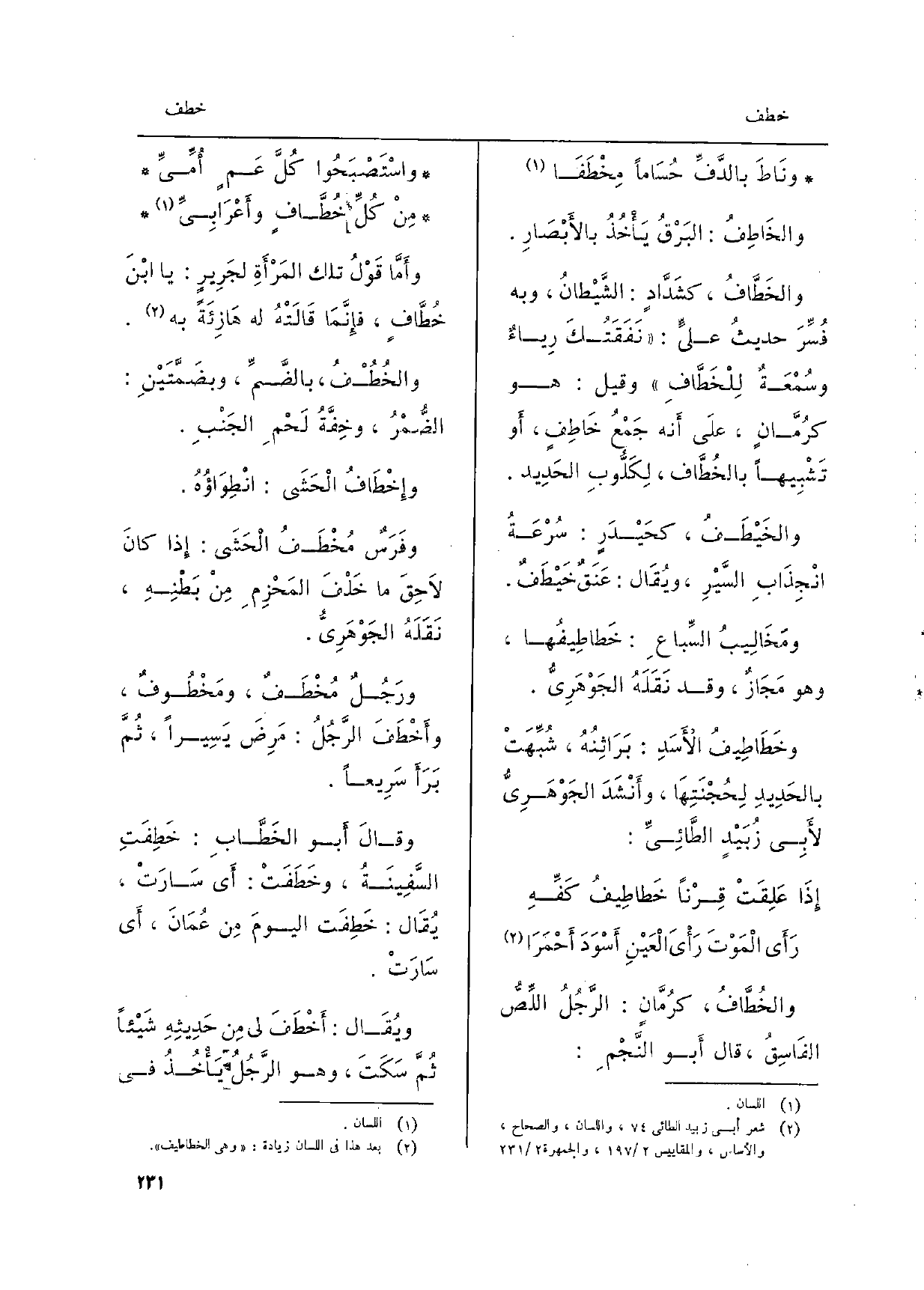 ونَاطَ بالدَّفِّ حُسَاماً مِخْطَفَا والخَاطِفُ: البَرْقُ يَأْخُذُ بالأَبْصَارِ. والخَطَّافُ، كشَدَّادٍ: الشَّيْطانُ، وَبِه فُسِّرَ حديثُ عليٍّ: نَفَقَتُكَ رِياءٌ وسُمْعَةٌ لِلْخَطَّافِ وَقيل: هُوَ كرُمَّانٍ، علَى أَنه جَمْعُ خَاطِفٍ، أَو تَشْبِيهاً بالخُطَّاف، لِكَلُّوبِ الحَدِيد. والخَيْطَفُ، كحَيْدَرٍ: سُرْعَةُ انْجِذَابِ السَّيْرِ، ويُقَال: عَنَقٌ خَيْطَفٌ. ومَخَالِيبُ السِّباعِ: خَطاطِيفُها، وَهُوَ مَجَازٌ، وَقد نَقَلَهُ الجَوْهَرِيُّ. وخَطَاطِيفُ الأَسَدِ: بَرَاثِنُهُ، شُبِّهَتْ بالحَدِيدِ لِحُجْنَتِهَا، وأَنْشَدَ الجَوْهَرِيُّ لأَبِي زُبَيْدٍ الطَّائِيِّ: إِذَا عَلِقَتْ قِرْناً خَطاطِيفُ كَفِّهِرَأَى الْمَوْتَ رَأْىَ الْعَيْنِ أَسْوَدَ أَحْمَرَا والخُطَّافُ، كرُمَّانٍ: الرَّجُلُ اللِّصُّ الفَاسِقُ، قَالَ أَبو النَّجْمِ: واسْتَصْبَحُوا كُلَّ عَمٍ أُمِّيِّ مِنْ كُلِّ خُطَّافٍ وأَعْرَابِيِّ وأَمَّا قَوْلُ تِلْكَ المَرْأَةِ لجَرِيرٍ: يَا ابْنَ خُطَّافٍ، فإِنَّمَا قَالَتْهُ لَهُ هَازِئَةً بِهِ. والخُطُفُ، بالضَّمِّ، وبضَمَّتَيْنِ: الضُّمْرُ، وخِفَّةُ لَحْمِ الجَنْبِ. وإِخْطَافُ الْحَشَى: انْطِوَاؤُهُ. وفَرَسٌ مُخَطُ الْحَشَى: إِذا كانَ لاَحِقَ مَا خَلْفَ المَحْزِمِ مِنْ بَطْنِهِ، نَقَلَهُ الجَوْهَرِيُّ. ورَجُلٌ مُخْطَفٌ، ومَخْطُوفٌ، وأَخْطَفَ الرَّجُلُ: مَرِضَ يَسِيراً ن ثُمَّ بَرَأَ سَرِيعاً. وقالَ أَبو الخَطَّابِ: خَطِفَتِ السَّفِينَةُ، وخَطَفَتْ: أَي سَارَتْ، يُقَال: خَطِفَت اليومَ مِن عُمَانَ، أَي سَارَتْ.