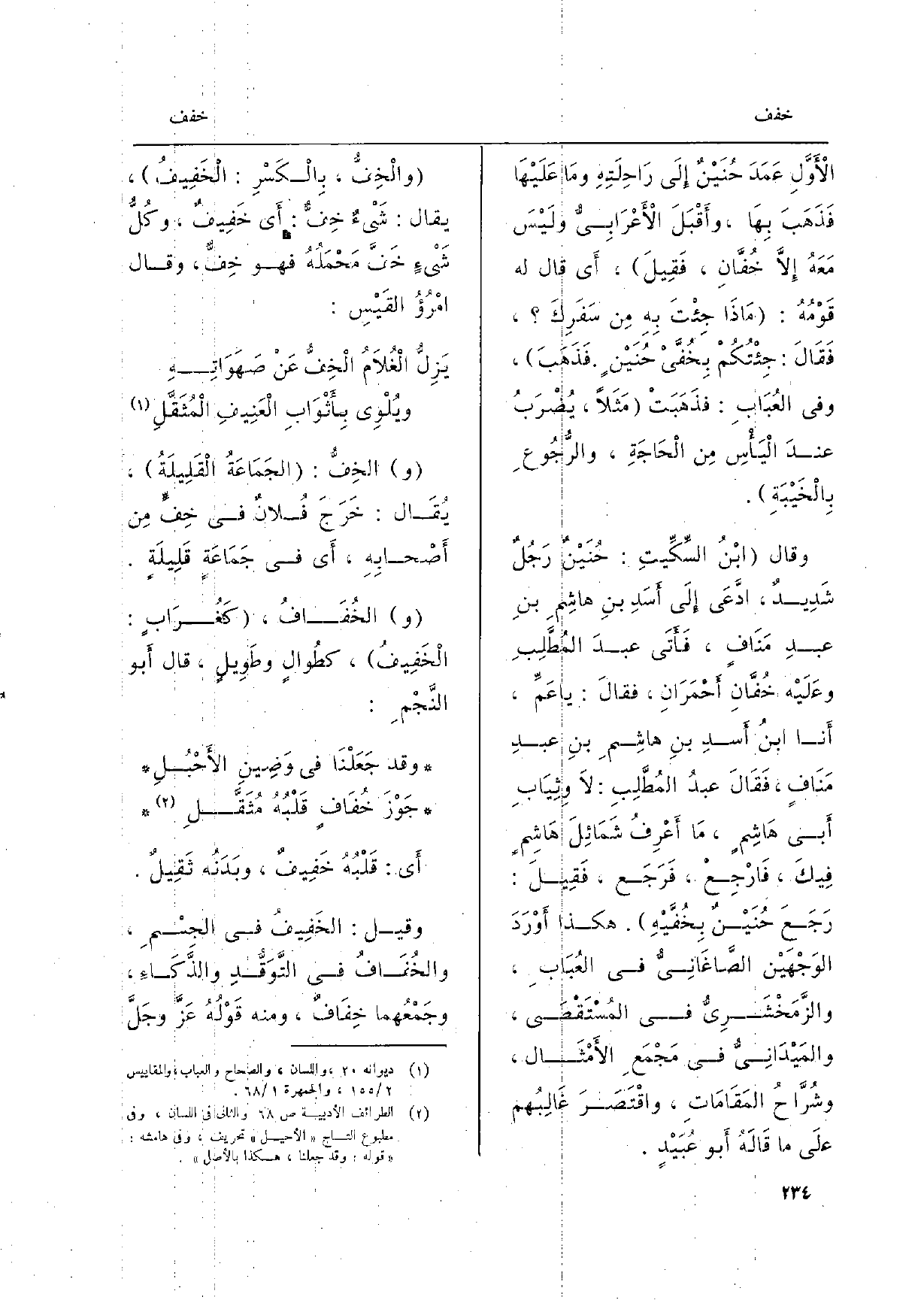 وَقَالَ ابْنُ السِّكِّيتِ: حُنَيْنٌ رَجُلٌ شَدِيدٌ، ادَّعَى إِلَى أَسَدِ بنِ هاشِمِ بنِ عبدِ مَنَافٍ، فَأَتَى عبدَ المُطَّلِبِ وعَلَيْه خُفَّانِ أَحْمَرَانِ، فقالَ: يَا عَمِّ، أَنَا ابنُ أَسدِ بنِ هاشِمِ بنِ عبدِ مَنَافٍ، فَقَالَ عبدُ المُطَّلِبِ: لاَ وِثِيَابِ أَبي هَاشِمٍ، مَا أَعْرِفُ شَمَائِلَ هَاشِمٍ فِيكَ، فَارْجِعْ، فَرَجَع، فَقِيلَ: رَجَعَ حُنَيْنٌ {بِخُفَّيْهِ. هَكَذَا أَوْرَدَ الوَجْهَيْنِ الصَّاغَانِيُّ فِي العُبَابِ، والزَّمَخْشَرِيُّ فِي المُسْتَقْصَى، والمَيْدَانِيُّ فِي مَجْمَعِ الأَمْثَال، وشُرَّاحُ المَقَامَاتِ، واقْتَصَرَ غَالِبُهم علَى مَا قَالَهُ أَبو عُبَيْدٍ.