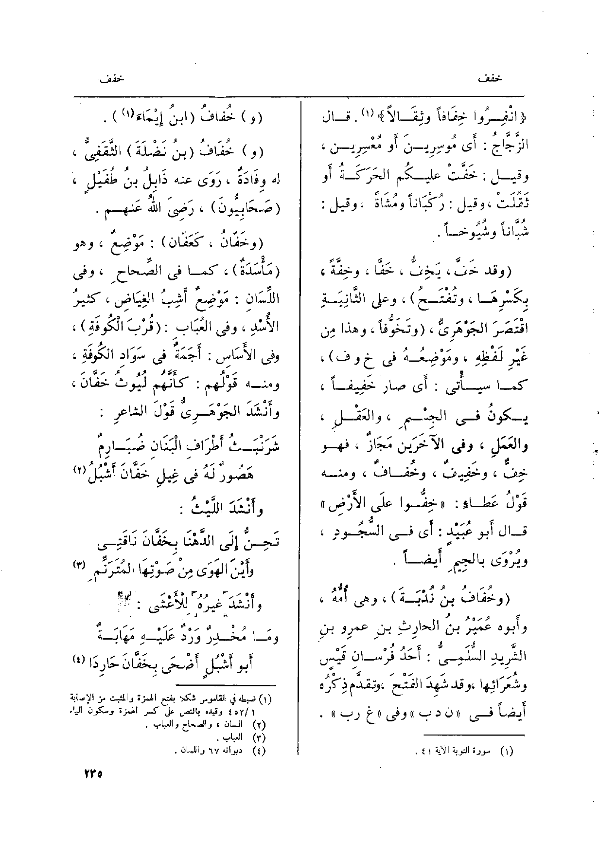 انْفِرُوا {خِفَافاً وثِقَالاً (. قَالَ الزَّجَّاجُ: أَي مُوسِرِينَ أَو مُعْسِرِين، وَقيل:} خَفَّتْ عليكُم الحَرَكَةُ أَو ثَقُلَتْ، وَقيل: رُكْبَاناً ومُشَاةً، وَقيل: شُبَّاناً وشُيُوخاً. وَقد {خَفَّ،} يَخِفُّ، {خَفّاً،} وخِفَّةً، بِكَسْرِهَا، وتُفْتَحُ، وعَلى الثَّانِيَةِ اقْتَصَرَ الجَوْهَرِيُّ، وتَخَوُّفاً، وَهَذَا مِن غَيْرِ لَفْظِهِ، ومَوْضِعُهُ فِي خَ وف، كَمَا سيأْتي: أَي صَار {خَفِيفاً، يكونُ فِي الجِسْمِ، والعَقْلِ، والعَمَلِ، وَفِي الآخَرَين مَجَازٌ، فَهُوَ} خِفٌّ، {وخَفِيفٌ،} وخُفافٌ، وَمِنْه قَوْلُ عَطاءٍ: {خِفُّوا علَى الأَرْضِ قَالَ أَبو عُبَيْدٍ: أَي فِي السُّجُودِ، ويُرْوَى بالجِيمِ أَيضاً.} وخُفَافُ بنُ نُدْبَةَ، وَهِي أُمُّهُ، وأَبوه عُمَيْرُ بنُ الحارِثِ بنِ عمرِو بنِ الشَّرِيدِ السُّلَمِيُّ: أَحَدُ فُرْسانِ قَيْسٍ وشُعَرَائِها، وَقد شَهِدَ الفَتْحَ، وتقدَّم ذِكْرُه أَيضاً فِي ن د ب وَفِي غ ر ب. (و) {خُفافُ ابنُ إِيْمَاءَ. خُفَافُ بنُ نَضْلَةَ الثَّقَفِيُّ، لَهُ وِفَادَةٌ، رَوَى عَنهُ ذَابِلُ بنُ طُفَيْلٍ، صَحَابِيُّونَ، رَضِيَ اللهُ عَنهم.} وخَفّانُ، كَعَفَّان: مَوْضِعٌ، وَهُوَ مَأْسَدَةٌ، كَمَا فِي الصِّحاحِ، وَفِي)