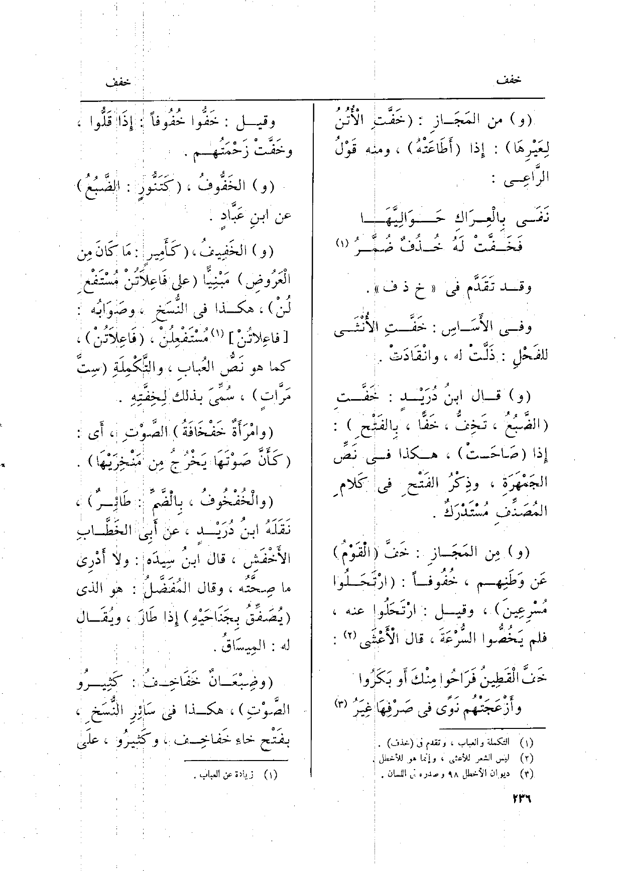 وَقيل: {خَفُّوا خُفُوفاً: إِذَا قَلُّوا،} وخَفَّتْ زَحْمَتُهم. (و) {الخَفُّوفُ، كَتَنُّورٍ: الضَّبُعُ عَن ابنِ عَبَّادٍ. (و) } الخَفِيفُ، كَأَمِيرٍ: مَا كَانَ مِن الْعَرُوضِ مَبْنِيّاً على فَاعِلاَتُنْ مُسْتَفْعِلُن، هَكَذَا فِي النُّسَخِ، وصَوَابُه: فاعِلاتُنْ مُسْتَفْعِلُنْ، فَاعِلاَتُنْ، كَمَا هُوَ نَصُّ العُبابِ، والتَّكْمِلَةِ سِتَّ مَرَّاتٍ، سُمِّيَ بذلك {لِخِفَّتِهِ. وامْرَأَةٌ} خَفْخَافَةُ الصَّوْتِ، أَي: كَأَنَّ صَوْتَهَا يَخْرُجُ مِن مَنْخِرَيْهَا. {والْخُفْخُوفُ، بِالْضَّمِّ: طَائِرٌ، نَقَلَهُ ابنُ دُرَيْدٍ، عَن أَبِي الخَطَّابِ الأَخْفَشِ، قَالَ ابنُ سِيدَه: وَلَا أَدْرِي مَا صِحَّتُه، وَقَالَ المُفَضَّلُ: هُوَ الَّذِي يُصَفِّقُ بِجَنَاحَيْهِ إِذا طَارَ، ويُقَال لَهُ: المِيسَاقُ. وضِبْعَانٌ} خَفَاخِفُ: كَثِيرُو الصَّوْتِ، هَكَذَا فِي سَائِرِ النُّسَخِ، بفَتْحِ خاءِ خَفاخِف، وكَثيرُو، علَى