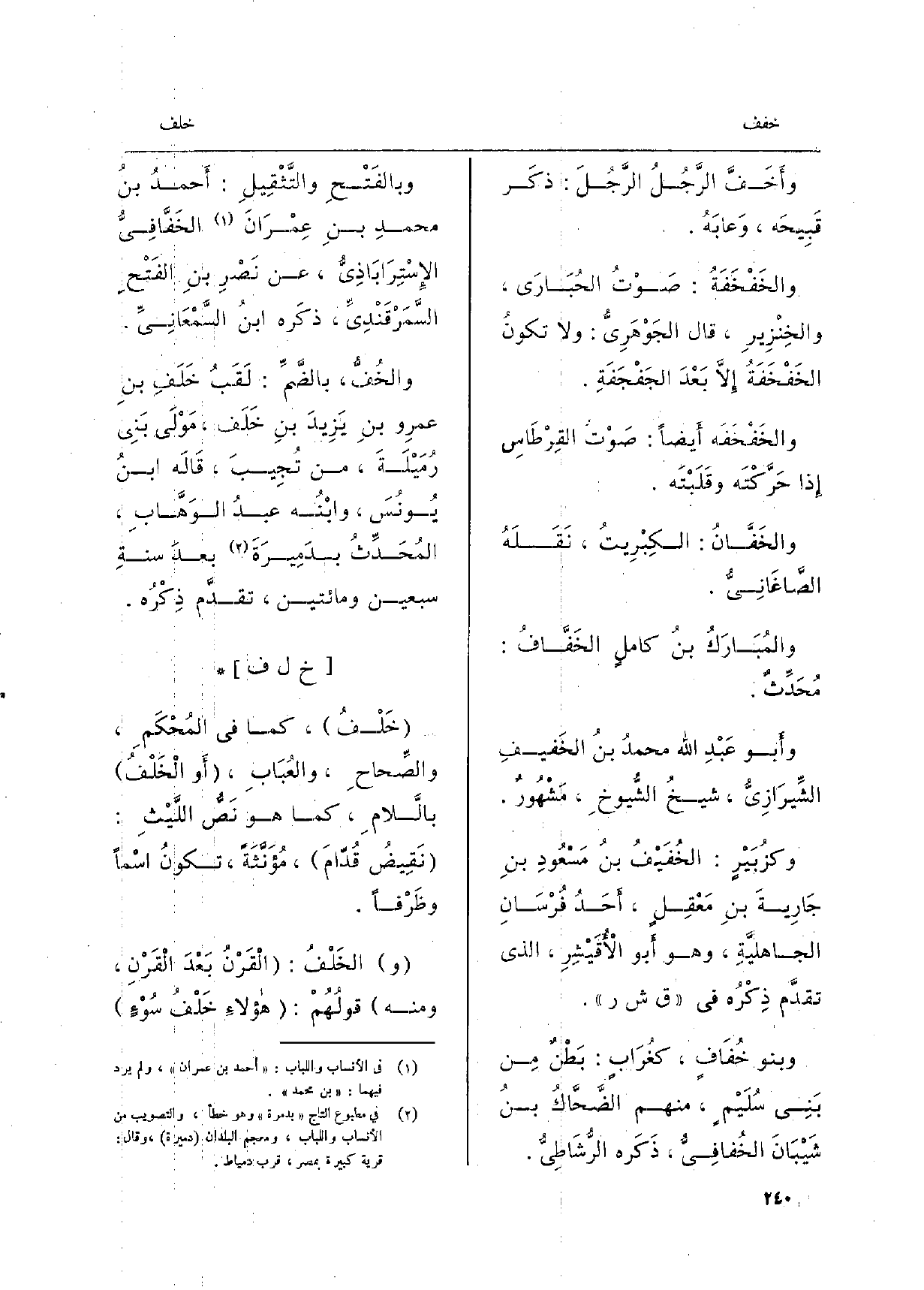 والمُبَارَكُ بنُ كاملٍ {الخَفَّافُ: مُحَدِّثُ. وأَبو عَبْدِ الله محمدُ بنُ} الخَفيفِ الشِّيرَازِيُّ، شيخُ الشُّيوخِ، مَشْهُورٌ. وكزُبَيْرٍ: {الخُفَيْفُ بنُ مَسْعُودِ بن جَارِيةَ بنِ مَعْقِلٍ، أَحَدَ فُرْسَانِ الجاهليَّةِ، وهوأَبو الأُقَيْشِر، الَّذِي تقدّم ذِكْرُه فِي ق ش ر. وَبَنُو} خُفَافٍ، كغُرَابٍ: بَطْنٌ مِن بَنِي سُلَيْمٍ، مِنْهُم الضَّحَّاكُ بنُ شَيْبَانَ {الخُفافِيُّ، ذَكَرَه الرُّشَاطِيُّ. وبالفَتْحِ والتَّثْقِيلِ: أَحمدُ بنُ محمدِ بنِ عِمْرَانَ} الخَفَّافِيُّ الإِسْتِرَابَاذِيُّ، عَن نَصْرِ بنِ الفَتْحِ السَّمَرْقَنْدِيِّ، ذكَره ابنُ السَّمْعَانِيِّ.! والخُفُّ، بالضَّمِّ: لَقَبُ خَلَفِ بنِ عمرِو بنِ يَزِيدَ بنِ خَلَف، مَوْلَى بَنِي رُمَيْلَةَ، من تُجِيبَ، قَالَه ابنُ يُونُسَ، وابْنُه عبدُ الوَهَّابِ، المُحَدِّثُ بدَمِيرَةَ بعدَ سنةِ سبعين وَمِائَتَيْنِ، تقدَّم ذِكْرُه. 3 (