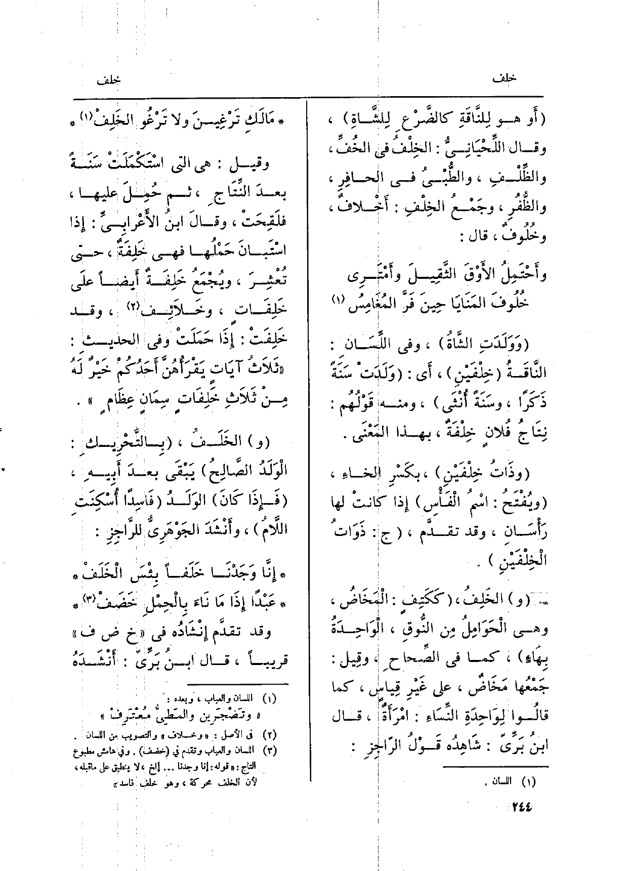 وَوَلَدَتِ الشَّاةُ، وَفِي اللِّسَانِ: النَّاقَةُ خِلْفَيْنِ، أَي: وَلَدَتْ سَنَةً ذَكَراً، وسَنَةً أُنْثَى، وَمِنْه قَوْلُهُم: نِتَاجُ فُلانٍ خِلْفَةٌ، بِهَذَا المَعْنَى. وذَاتُ خِلْفَيْنِ، بكَسْرِ الخاءِ، ويُفْتَحُ: اسْمُ الْفَأْسِ إِذا كانتْ لَهَا رَأْسَانِ، وَقد تقدَّمَ، ج: ذَوَاتُ الْخِلْفَيْنِ. الخَلِفُ، كَكَتِفٍ: الْمَخَاضُ، وَهِي الْحَوَامِلُ مِن النُّوقِ، الْوَاحِدَةُ) بِهَاءٍ، كَمَا فِي الصِّحاحِ، وقِيل: جَمْعُها مَخَاضٌ، على غَيْرِ قِياسٍ، كَمَا قالُوا لِوَاحِدَةِ النِّسَاءِ: امْرَأَةٌ، قَالَ ابنُ بَرِّيّ: شَاهِدُه قَوْلُ الرّاجِزِ: مَالَكِ تَرْغِينَ وَلَا تَرْغُو الخَلِفْ وَقيل: هِيَ الَّتِي اسْتَكْمَلَتْ سَنَةً بعدَ النِّتَاجِ، ثمَّ حُمِلَ عَلَيْهَا، فلَقِحَتْ، وقالَ ابنُ الأَعْرَابِيِّ: إِذا اسْتَبانَ حَمْلُها فَهِيَ خَلِفَةٌ، حَتَّى تُعْشِرَ، ويَجْمَعُ خَلِفَةٌ أَيضاً علَى خَلِفَاتِ، وخَلاَئِف، وَقد خَلِفَتْ: إِذَا حَمَلَتْ وَفِي الحديثِ: ثَلاَثُ آيَاتٍ يَقْرَأُهُنَّ أَحَدُكُمْ خَيْرٌ لَهُ مِنْ ثَلاَثِ خَلِفَاتٍ سِمَانٍ عِظامٍ.