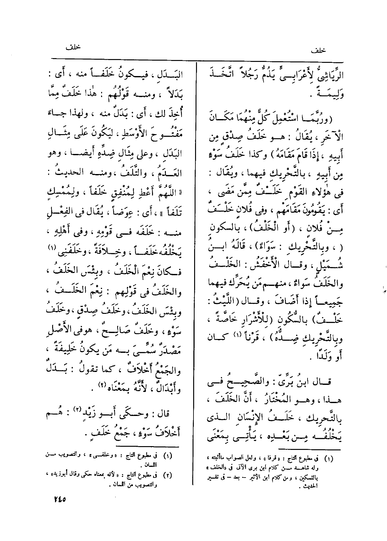 الرِّيَاشِيُّ لأَعْرَابِيٍّ يَذُمُّ رَجُلاً اتَّخَذَ وَلِيمَةً. ورُبَّمَا اسْتُعْمِلَ كُلٌّ مِنْهُمَا مَكَانَ الآخَرِ، يُقَالُ: هُوَ خَلَفُ صِدْقٍ مِن أَبِيهِ، إِذَا قَامَ مَقَامَهُ وَكَذَا خَلَفُ سَوْءٍ مِن أَبِيهِ، بالتَّحْرِيكِ فيهمَا، ويُقَال: فِي هؤلاءِ القَوْمِ خَلَفٌ مِمَّن مَضَى، أَي: يَقُومُونَ مَقَامَهْم، وَفِي فُلانٍ خَلْفٌ مِنْ فُلانٍ، أَو الْخَلْفُ، بالسكونِ، وبِالتَّحْرِيكِ: سَوَاءٌ، قَالَهُ ابنُ شُمَيْلٍ، وَقَالَ الأخْفَشُ: الخَلْفُ والخَلَفُ سَواءٌ، مِنْهُم مَن يُحَرَّك فيهمَا جَمِيعاً إِذا أَضَافَ، وَقَالَ اللَّيْثُ: خَلْفٌ بالسُّكُونِ لِلأَشْرَارِ خَاصَّةً، وبِالتَّحْرِيكِ ضِدُّهُ، قَرْناً كَانَ أَو وَلَداً. قَالَ ابنُ بَرِّيّ: والصَّحِيحُ فِي هَذَا، وَهُوَ المُخْتَارُ، أَنَّ الخَلَفَ، بالتَّحرِيك، خَلَفُ الإِنْسَانِ الَّذِي يَخْلُفُه مِن بَعْدِه، يَأْتِي بِمَعْنَى البَدَلِ، فيكونُ خَلَفاً مِنْهُ، أَي: بَدَلاً، وَمِنْه قَوْلُهُم: هَذَا خَلَفٌ مِمَّا أُخِذَ لَك، أَي: بَدَلٌ مِنْهُ، وَلِهَذَا جاءَ مَفْتُوحَ الأَوْسَطِ، ليَكُونَ عَلَى مِثَالِ البَدَلِ، وعَلى مِثَالِ ضِدَّهِ أَيضا، وَهُوَ العَدَمُ، والتَّلَفُ، وَمِنْه الحديثُ: اللَّهُمَّ أَعْطِ لِمُنْفِقٍ خَلَفاً، ولِمُمْسِكٍ تَلَفاً، أَي: عِوَضاً، يُقَال فِي الفِعْلِ مِنْهُ: خَلَفَه فِي قَوْمِهِ، وَفِي أَهْلِهِ، يَخْلُفُهُ خَلَفاً، وخِلاَفَةً، وخَلَفَنِي فكانَ نِعْمَ الْخَلَفُ، وبِئْسَ الخَلَفُ، والخَلَفُ فِي قَوْلِهم: نِعْمَ الخَلَفُ، وبِئْسَ الخَلَفُ، وخَلَفُ صِدْقٍ، وخَلَفُ سَوْءٍ، وخَلَفٌ صَالِحٌ، هوفي الأَصْلِ مَصْدَرٌ سُمِّيَ بِهِ مَن يكونُ خَلِيفَةً، والجَمْعُ أَخْلاَفٌ، كَمَا تقولُ: بَدَلٌ وأَبْدَالٌ، لأَنَّهُ بمَعْنَاه. قَالَ: وحكَى أَبو زَيْدٍ: هُم أَخْلاَفُ سَوْءٍ، جَمْعُ خَلَفٍ. قَالَ: