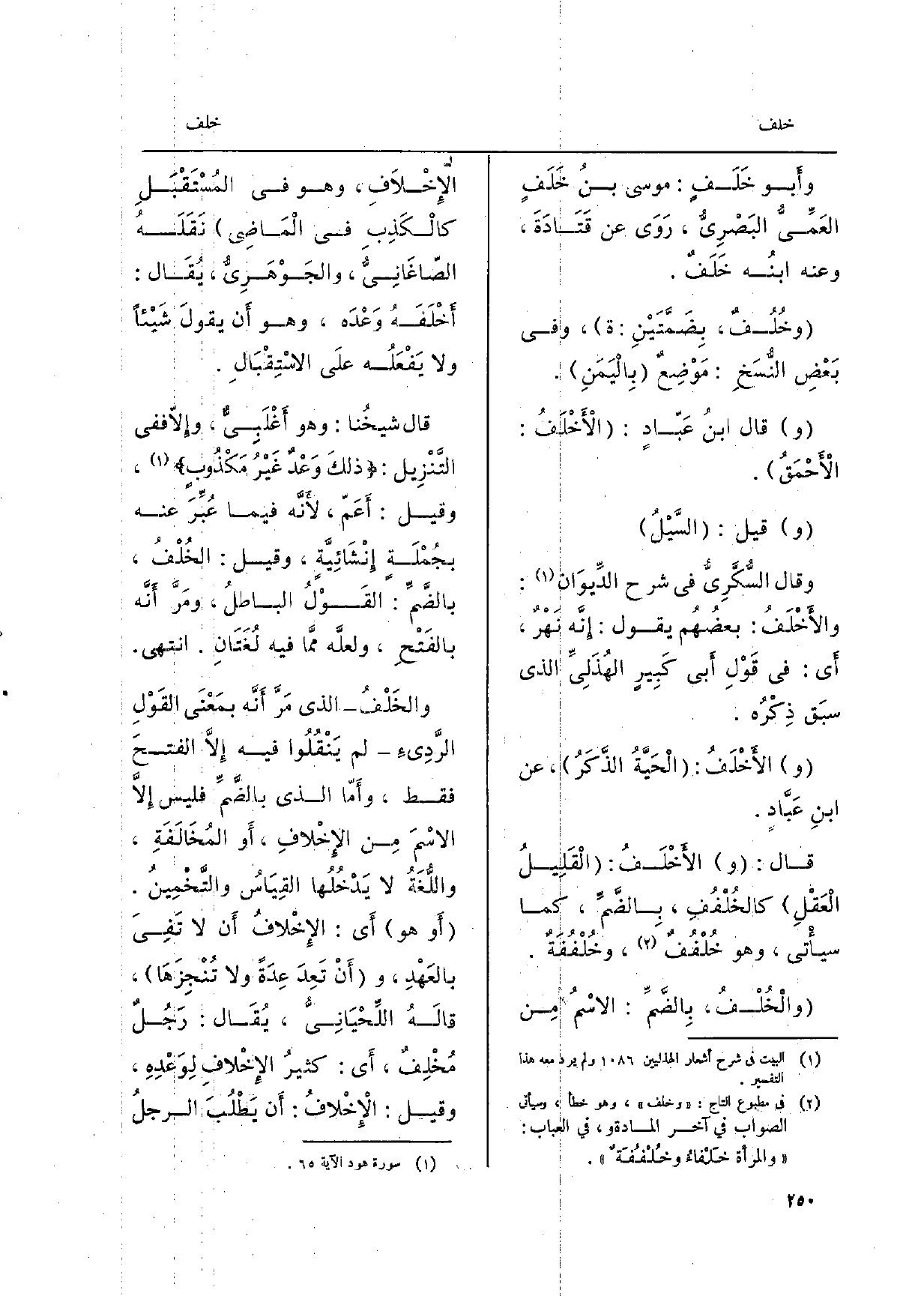 والخَلْفُ الَّذِي مَرَّ أَنَّه بمَعْنَى القَوْلِ الرَّدِىءِ لم يَنْقُلُوا فِيهِ إِلاَّ الفتحَ فَقَط، وأَمّا الَّذِي بالضَّمِّ فَلَيْسَ إِلاَّ الاسْمَ مِن الإِخْلافِ، أَو المُخَالَفَةِ، واللَّغَةُ لَا يَدْخُلُها القِيَاسُ والتَّخْمِينُ. أَو هُوَ أَي: الإخْلافُ أَن لَا تَفِيَ بالعَهْدِ، وأَنْ تَعِدَ عِدَةً وَلَا تُنْجِزَهَا، قالَهُ اللِّحْيَانِيُّ، يُقَال: رَجُلٌ مُخْلِفٌ، أَي: كثيرُ الإِخْلافِ لِوَعْدِهِ، وَقيل: الإِخْلافُ: أَن يَطْلُبَ الرجلُ