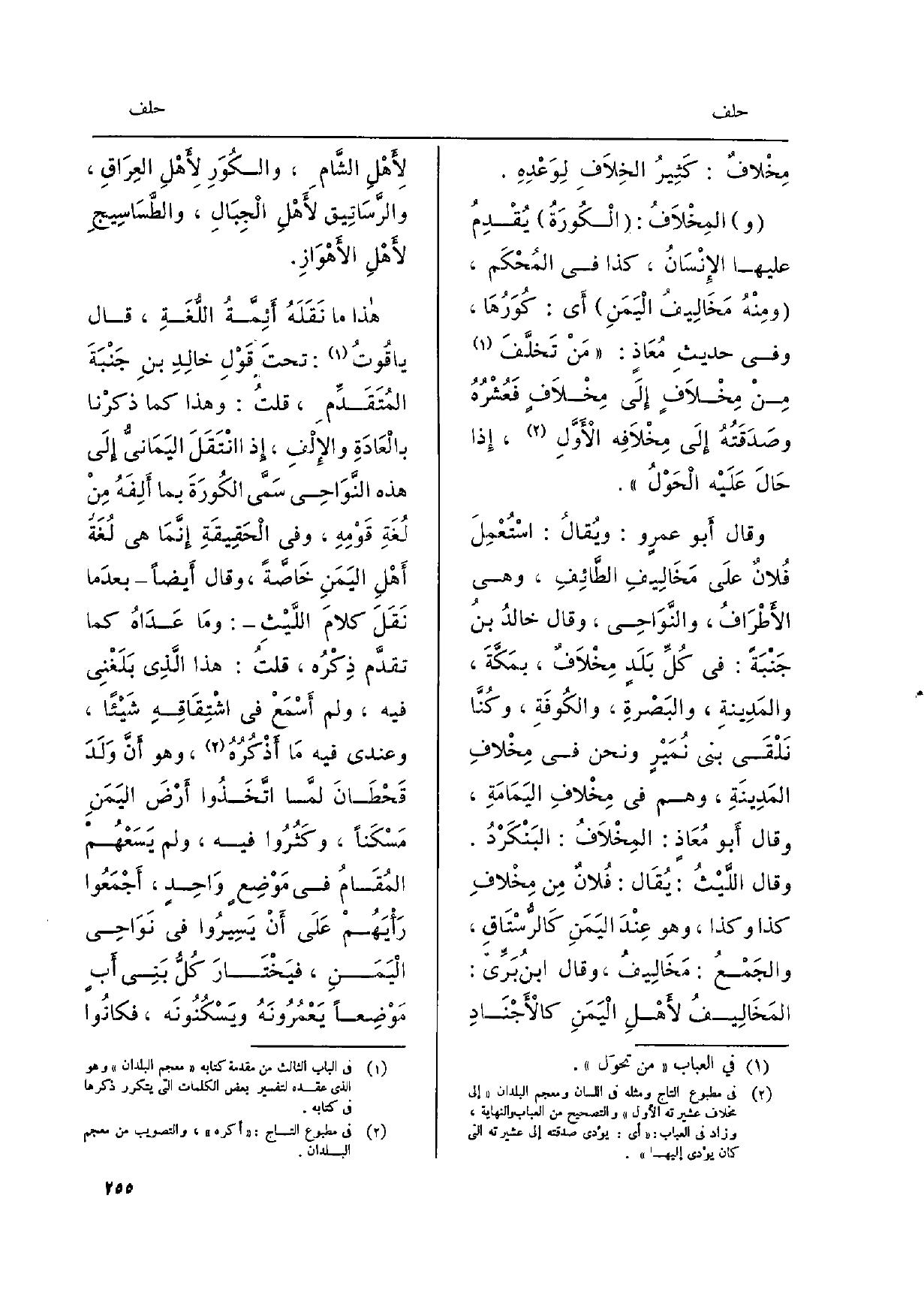 مِخْلافٌ: كَثِيرُ الخِلاَفِ لِوَعْدِهِ. المِخْلاَفُ: الْكُورَةُ يُقْدِمُ عَلَيْهَا الإنْسَانُ، كَذَا فِي المُحْكَم، ومِنْهُ مَخَالِيفُ الْيَمَنِ أَي: كُوَرُهَا، وَفِي حديثِ مُعَاذٍ: مَنْ تَخلَّفَ مِنْ مِخْلاَفٍ إِلَى مِخْلاَفٍ فَعُشْرُهُ وصَدَقَتُهُ إِلَى مِخلافِه الأَوَّلِ، إِذا حَالَ عَلَيْه الْحَوْلُ. وقالأَبو عمرٍ و: ويُقالُ: اسْتُعْمِلَ فُلانٌ علَى مَخَالِيفِ الطَّائِفِ، وَهِي الأَطْرَافُ، والنَّوَاحِي، وَقَالَ خالدُ بنُ جَنْبَةً: فِي كُلِّ بَلَدٍ مِخْلاَفٌ، بمَكَّةَ، والمَدِينةِ، والبَصْرَةِ، والكُوفَةِ، وكَنَّا نَلْقَى بنِ نُمَيْرٍ وَنحن فِي مِخْلافِ المَدِينَةِ، وهم فِي مِخْلافِ اليَمَامَةِ، وَقَالَ أَبو مُعَاذٍ: المِخْلاَفُ: البَنْكَرْدُ. وَقَالَ اللَّيْثُ: يُقَال: فُلانٌ مِن مِخْلافِ كَذَا وَكَذَا، وَهُوَ عِنْدَ اليَمَنِ كَالرُّسْتَاقِ، والجَمْعُ: مَخَالِيفُ، وَقَالَ ابنُ بَرِّي: المَخَالِيفُ لأَهْلِ الْيَمْنِ كالأَجْنَادِ لأَهْلِ الشَّامِ، والكُوَرِ لأَهْلِ العِرَاقِ، والرَّسَاتِيق لأَهْلِ الْجِبَالِ، والطَّسَاسِيجِ لأَهْلِ الأَهْوَازِ. هَذَا مانَقَلَهُ أَئِمَّةُ اللُّغَةِ، قَالَ ياقُوتُ: تحتَ قَوْلِ خالِدِ بنِ جَنْبَةَ المُتَقَدِّمِ، قلتُ: وَهَذَا كَمَا ذكرْنا بالْعَادَةِ والإِلْفِ، إِذا)