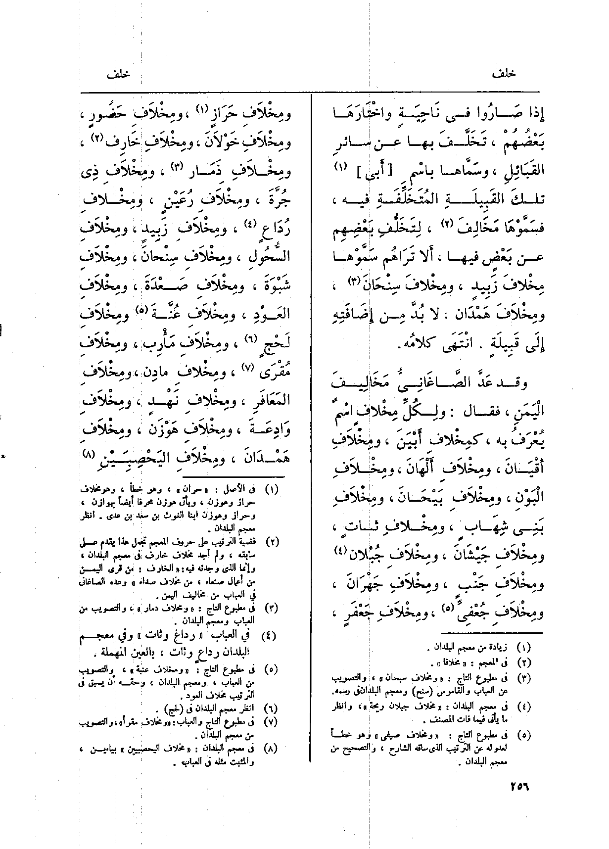 إِذا صَارُوا فِي نَاحِيَةٍ واخْتَارَهَا بَعْضُهُمْ، تَخَلَّفَ بهَا عَن سائرِ القَبَائِلِ، وسَمَّاها باسْمِ أَبي تلكَ القَبِيلَةِ المُتَخَلِّفَةِ فِيهِ، فسَمَّوْهَا مَخَالِفَ، لِتَخَلُّفِ بَعْضِهِم عَن بَعْضٍ فِيهَا، أَلا تَرَاهُم سَمَّوْها مِخْلافَ زَبِيدٍ، ومِخْلافَ سِنْحَانَ، ومِخْلاَفَ هَمَدَان، لَا بُدَّ مِن إِضَافَتِهِ إِلَى قَبِيلَةٍ. انْتَهَى كلامُه. وَقد عَدَّ الصَّاغَانِيُّ مَخَالِيفَ الْيَمَنِ، فَقَالَ: ولِكُلِّ مِخْلاف اسْمٌ يُعْرَفُ بِهِ، كمِخْلاف أَبْيَنَ، ومِخْلاَفِ أَقْيَانَ، ومِخْلاَفِ أَلْهَانَ، ومِخْلاَفِ الْبَوْنِ، ومِخْلاَفِ بَيْحَانَ، ومِخْلاَفِ بَنِي شِهَابٍ، ومِخْلافِ ثاتٍ ن ومِخْلاَفِ جَيْشَانَ، ومِخْلاَفِ جُبْلان ومِخْلاَفِ جَنْبٍ، ومِخْلاَفِ جَهْرَانَ، ومِخْلاَفِ جُعْفِيً، ومِخْلاَفِ جَعْفَرٍ، ومِخْلاَفِ حَرَازٍ، ومِخْلاَفِ حَضُورٍ، ومِخْلاَفِ خَوْلاَنَ، ومِخْلاَفِ خَارِف، ومِخْلاَفِ ذَمَار، ومِخْلاَفِ ذِي جُرَّةَ، ومِخْلاَفِ رُعَيْنٍ، ومِخْلافِ رُدَاعٍ، ومِخْلاَفِ زَبِيدٍ، ومِخْلاَفِ السَّحُولِ، ومِخْلاَفِ سِنْحانَ، ومِخْلاَفِ شَبْوَةِ، ومِخْلاَفِ عُنَّةَ ومِخْلاَفِ لَحْجٍ، ومِخْلاَفِ مَأْرِب، ومِخْلاَفِ مُقْرَى، ومِخْلافِ مادِن، ومِخْلاَفِ المَعَافَرِ، ومِخْلافِ نَهْدٍ، ومِخْلاَفِ المَعَافَرِ، ومِخْلاَفِ هَوْزَن، ومِخْلاَفِ هَمْدَانَ، ومِخْلاَفَ اليَحْصِبِيْنِ