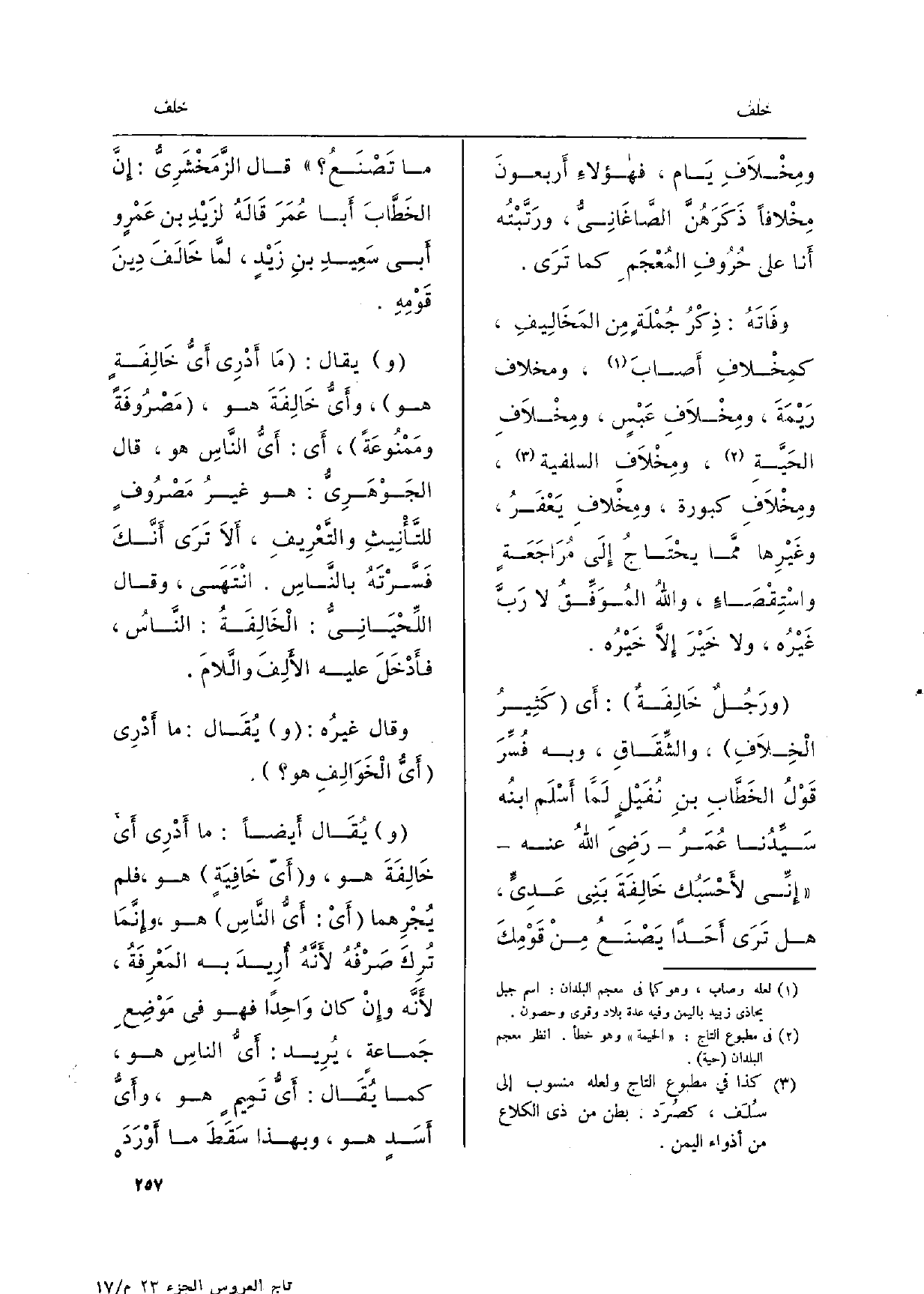 ومِخْلاَفِ يَام، فهؤلاءِ أَربعونَ مِخْلافاً ذَكَرَهُنَّ الصَّاغَانِيُّ، ورَتَّبْتُه أَنا على حُرُوفِ المُعْجَمِ كَمَا تَرَى. وفَاتَهُ: ذِكْرُ جُمْلَةٍ مِن المَخَالِيفِ، كمِخْلافِ أَصابَ، ومخلاف رَيْمَةَ، ومِخْلاَفِ عَبْسٍ، ومِخْلاَفِ الحَيَّةِ، ومِخْلاَفِ السلفية، ومِخْلاَفِ كبورة، ومِخْلافِ يَعْفَرُ، وغَيْرِها ممَّا يَحْتَاجُ إِلَى مُرَاجَعَةٍ واسْتِقْصَاءٍ، واللهُ المُوَفِّقُ لَا رَبَّ غَيْرُه، وَلَا خَيْرَ إِلاَّ خَيْرُه. ورَجُلٌ خَالِفَةٌ: أَي كَثِيرُ الْخِلاَفِ، والشِّقَاقِ، وَبِه فُسِّرَ قَوْلُ الخَطَّابِ بنِ نُفَيْلٍ لَمَّا أَسْلَم ابنُه سَيِّدُنا عُمَرُ رَضِيَ اللهُ عَنهُ إِنِّي لأَحْسَبُك خَالِفَةَ بَنِي عَدِىٍّ، هَل تَرَى أَحَداً يَصْنَعُ مِنْ قَوْمِكَ مَا تَصْنَعُ قَالَ الزَّمَخْشَرِيُّ: إِنَّ الخَطَّابَ أَبا عُمَرَ قَالَهُ لزَيْدِ بن عَمْرٍ وأَبي سَعِيدِ بنِ زَيْدٍ، لمَّا خَالَفَ دِينَ قَوْمِهِ. يُقَال: مَا أَدْرِي أَيُّ خَالِفَةٍ هُوَ، وأَيُّ خَالِفَةَ هُوَ، مَصْرُوفَةً ومَمْنُوعَةً، أَي: أَيُّ النَّاسِ هُوَ، قَالَ الجَوْهَرِيُّ: هُوَ غيرُ مَصْرُوفٍ للتَّأْنِيثِ والتَّعْرِيفِ، أَلاَ تَرَى أَنَّكَ فَسَّرْتَهُ بالنَّاسِ. انْتَهَى، وَقَالَ اللِّحْيَانِيُّ: الْخَالِفَةُ: النَّاسُ، فأَدْخَلَ عَلَيْهِ الأَلِفَ والَّلامَ.)