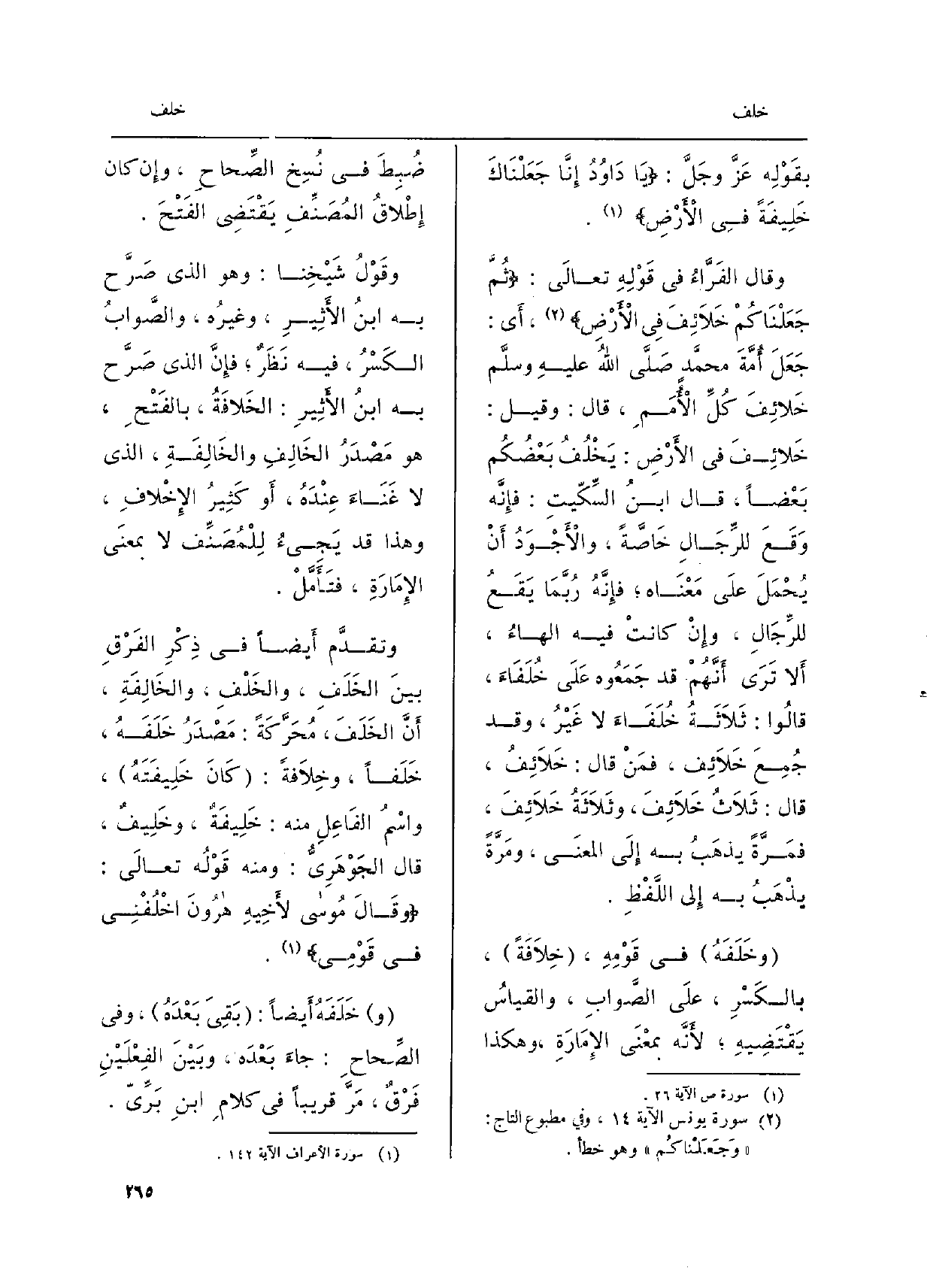 بِقَوْلِه عَزَّ وجَلَّ: يَا داَوُدُ إِنَّا جَعَلْنَاكَ خَلِيفَةً فِي الأَرْضِ. وَقَالَ الفَرَّاءُ فِي قَوْلِهِ تعالَى: ثُمَّ جَعَلْنَاكُمْ خَلاَئِفَ فِي الأَرْضِ، أَي: جَعَلَ أُمَّةَ محمَّدٍ صَلَّى اللهُ عليهِ وسلَّم خَلائِفَ فِي الأَرْضِ: يَخْلُفُ بَعْضُكُم بَعْضاً، قَالَ ابنُ السِّكِّيتِ: فإِنَّه وَقَعَ للرِّجَالِ خَاصَّةً، والأَجْوَدُ أَنْ يُحْمَلَ علَى مَعْنَاه فإِنَّهُ رُبَّمَا يَقَعُ للرِّجَالِ، وإِنْ كانتْ فِيهَا الهاءُ، أَلا تَرَى أَنَّهُمْ قد جَمَعُوه عَلَى خُلَفَاء، قالُوا: ثَلاَثَةُ خُلَفَاءَ لَا غَيْرُ، وَقد جُمِعَ خَلاَئِف، فمَنْ قَالَ: خَلاَئِفُ، قَالَ: ثَلاَثُ خَلاَئِفَ، وثَلاَثَةُ خَلاَئِفَ، فمَرَّةً يذهَبُ بِهِ إِلَى المعنَى، ومَرَّةً يذْهَبُ بِهِ إِلَى اللَّفْظِ. وخَلَفَهُ فِي قَوْمِهِ، خِلاَفَةً، بالكَسْرِ، علَى الصَّوَابِ، والقياسُ يَقْتَضِيهِ، لأَنَّه بمعْنَى الإِمَارَةِ، وَهَكَذَا ضُبِطَ فِي نُسخِ الصِّحاحِ، وإنِ كَانَ إِطْلاقُ المُصَنِّفِ يَقْتَضِي الفَتْحَ. وقَوْلَ شَيْخِنا: وَهُوَ الَّذِي صَرَّحَ بِهِ ابنُ الأَثِيرِ، وغيرُه، والصَّوابُ الكَسْرُ فِيهِ نَظَرٌ فإِنَّ الَّذِي صَرِّحَ بِهِ ابنُ الأَثِيرِ: الخَلافَةُ، بالفَتْحِ، هُوَ مَصْدَرُ الخَالِفِ والخَالِفَةِ، الَّذِي لَا غَنَاءَ عَنْدَهُ، أَو كَثِيرُ الإخْلافِ، وَهَذَا قد يَجِيءُ لِلْمُصَنِّف لَا بمعنَى الإِمَارَةِ، فتَأَمَّلْ. وتقدَّم أَيضاً فِي ذِكْرِ الفَرْقِ بينُ الخَلَفِ، والخَلْفِ، والخَالِفَةِ، أَنَّ الخَلَفَ، مُحَرَّكَةً: مَصْدَرُ خَلَفَهُ، خَلَفاً، وخِلاَفةً: كَانَ خَلِيفَتَهُ، واسْمُ الفَاعِلِ مِنْهُ: خَلِيفَةٌ، وخَلِيفٌ، قَالَ الجَوْهَرِيُّ: وَمِنْه قَوْلُه تعالَى: وقَالَ مُوسى لأَخِيهِ هرُونَ اخْلُفْنِي فِي قَوْمِي. خَلَفَهُ أَيضاً: بَقِيَ بَعْدَهُ، وَفِي الصِّحاحِ: جاءَ بَعْدَه، وبَيْنَ الفِعْلَيْنِ فَرْقٌ، مَرَّ قَرِيبا فِي كلامِ ابنِ بَرِّيّ.