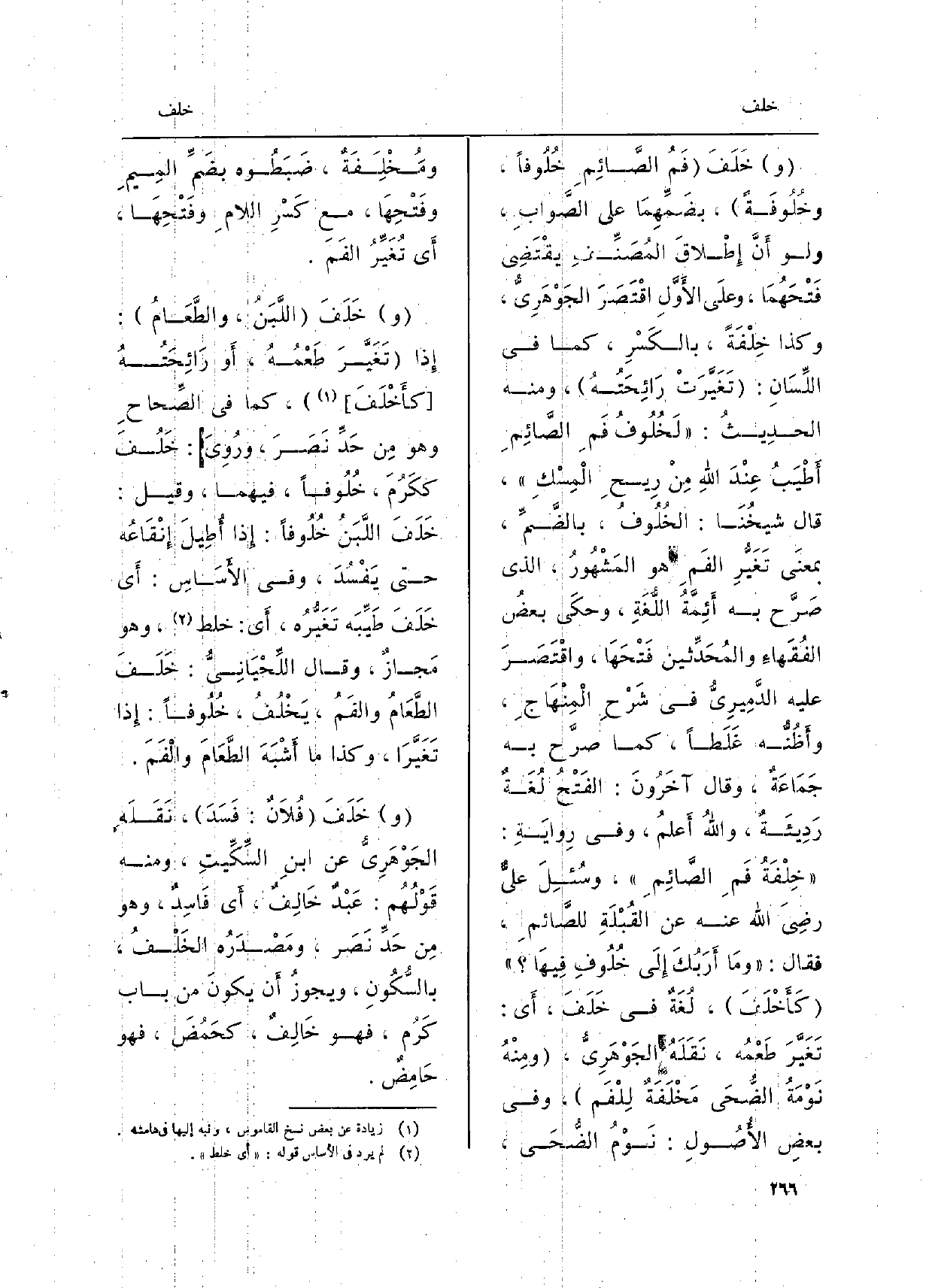 خَلَفَ فَمُ الصَّائِمِ خُلُوفاً، وخُلُوفَةً، بضَمِّهِمَا على الصَّوابِ، وَلَو أَنَّ إِطْلاقَ المُصَّنِفِ يقْتَضِي فَتْحَهُمَا، وعلَى الأَوَّلِ اقْتَصَرَ الجَوْهَرِيُّ، وَكَذَا خِلْفَةً، بالكَسْرِ، كَمَا فِي اللِّسَانِ: تَغَيَّرَتْ رَائِحَتُهُ، وَمِنْه الحدِيثُ: لَخُلُوفُ فَمَ الصَّائِمِ أَطْيَبُ عِنْدَ اللهِ مِنْ رِيحِ الْمِسْكِ، قَالَ شيخُنَا: الخُلُوفُ، بالضَّمِّ، بمعنَى تَغَيُّرِ الفَمِ هُوَ المَشْهُورُ، الَّذِي صّرَّحَ بِهِ أَئِمَّةُ اللُّغَةِ، وحكَى بعضُ الفُقَهاءِ والمُحَدِّثين فَتْحَهَا، واقْتَصَرَ عَلَيْهِ الدَّمِيرِيُّ فِي شَرْحِ الْمِنْهَاجِ، وأَظُّنُّه غَلَطاً، كَمَا صرَّح بِهِ جَمَاعَةٌ، وَقَالَ آخَرُونَ: الفَتْحُ لُغَةٌ رَدِيئَةٌ، واللهُ أَعلمُ، وَفِي رِوايَةِ: خِلْفَةُ فَمِ الصَّائِمِ، وسُئِلَ عليٌّ رضِيَ اللهُ عَنهُ عَن القُبْلَةِ للصَّائمِ، فَقَالَ: ومَا أَرَبُكَ إِلَى خُلُوفِ فِيهَا كَأَخْلَفَ، لُغَةٌ فِي خَلَفَ، أَي: تَغَيَّرَ طَعْمُه، نَقَلَهُ الجَوْهَرِيُّ، ومِنْهُ نَوْمَةُ الضُّحَى مَخْلَفَةٌ لِلْفَم، وَفِي بعضِ الأُصُولِ: نَوْمُ الضُّحَى، ومُخْلِفَةٌ، ضَبَطُوه بضَمِّ المِيمِ وفَتْحِهَا، مَعَ كَسْرِ اللامِ وفَتْحِهَا، أَي تُغَيِّرَ الفَمَ. خَلَفَ اللَّبَنُ، والطَّعَامُ: إِذا تَغَيَّر طَعْمُهُ، أَو رَائِحَتُهُ كأَخْلَفَ، كَمَا فِي الصِّحاحِ وَهُوَ مِن حَدِّ نَصَرَ،)