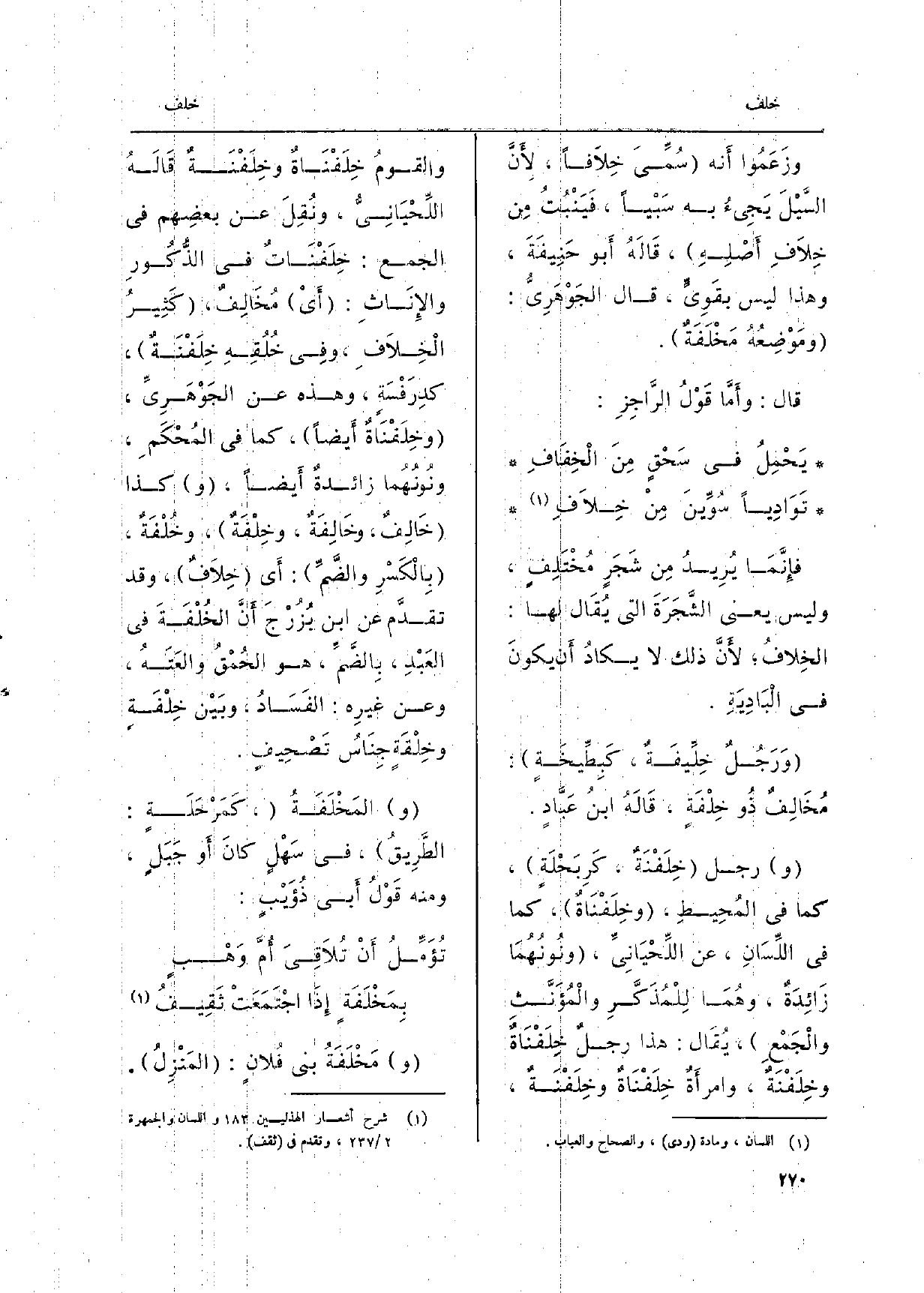 فإِنَّمَا يُرِيدُ مِن شَجَرِ مُخْتَلِفٍ، وَلَيْسَ يَعْنِي الشَّجَرَةَ الَّتِي يُقَال لَهَا: الخِلافُ لأَنَّ ذَلِك لَا يكَاد أَن يكونَ فِي الْبَادِيَةِ. وَرَجُلٌ خِلِّيفَةٌ، كَبِطِّيخَةٍ: مُخَالِفٌ ذُو خِلْفَةٍ، قَالَهُ ابنُ عَبَّادٍ. رجل خِلَفْنَةٌ، كَرِبَحْلَةٍ، كَمَا فِي المُحِيطِ، وخِلْفَناةٌ، كَمَا فِي اللِّسَانِ، عَن اللِّحْيَانِيِّ، ونُونُهُمَا زَائِدَةٌ، وهُمَا لِلْمُذَكَّرِ والْمُؤَنَّثِ والْجَمْعِ، يُقَال: هَذَا رجلٌ خِلَفْنَاةٌ وخِلَفْنَةٌ، وامرأَةٌ خِلَفْنَاةٌ وخِلَفْنَةٌ، والقومُ خِلَفْنَاةٌ وخِلَفْنَةٌ قألَهُ اللِّحْيَانِيُّ، ونُقِلَ عَن بعضِهم فِي الْجمع: خِلَفْنَاتٌ فِي الذُّكُورِ والإِنَاثِ: أَيْ مُخَالِفٌ، كَثِيرُ الْخِلاَفِ، وَفِي خُلُقِهِ خِلَفْنَةٌ، كدِرَفْسَةٍ، وَهَذِه عَن الجَوْهَرِيِّ، وخِلْفْنَاةٌ أَيضاً، كَمَا فِي المُحْكَمِ، ونُونُهُما زائدةٌ أَيضاً، كَذَا خَالِفٌ، وخَالِفَةٌ، وخِلْفَةٌ، وخُلْفَةٌ، بِالْكَسْرِ والضَّمِّ: أَي خِلاَفٌ، وَقد تقدَّم عَن ابْن بُزُرْجَ أَنَّ الخُلْفَةَ فِي العَبْدِ، بِالضَّمِّ، هُوَ الحُمْقُ والعَتَهُ، وَعَن غيرِهِ: الفَسَادُ، وبَيْن خِلْفَةٍ وخِلْقَةٍ جِنَاسُ تَصْحِيفٍ. المَخْلَفَةُ، كَمَرْحَلَةٍ: الطَّرِيقُ، فِي سَهْلٍ كانَ أَو جَبَلٍ، وَمِنْه قَوْلُ أَبي ذُؤَيْبٍ: