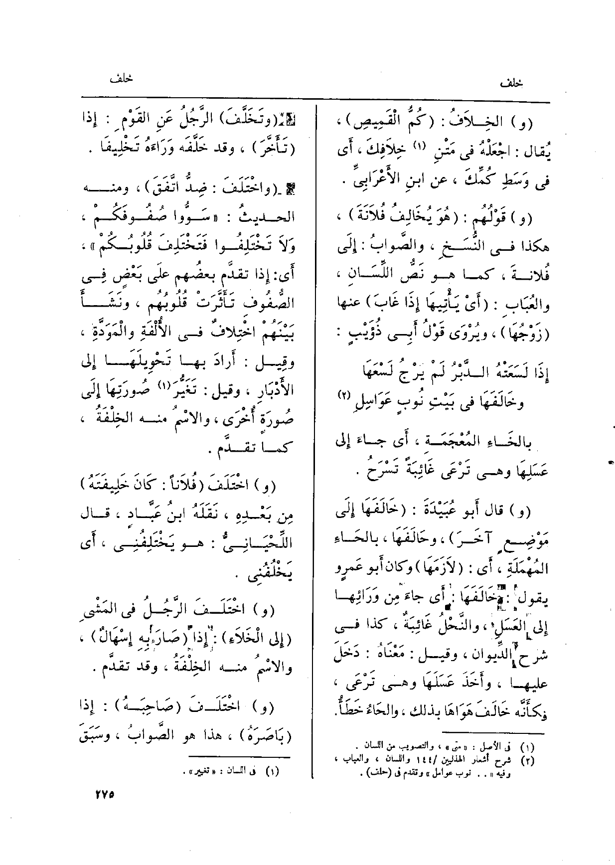 بالخَاءِ المَعْجَمَةِ، أَي جاءَ إِلى عَسَلِهَا وَهِي تَرْعَى غَائِبَةً تَسْرَحُ. قَالَ أَبو عُبَيْدَةَ: خَالَفَهَا إِلَى مَوْضِعٍ آخَرَ، وحَالَفَهَا، بالحَاءِ المُهْمَلَةِ: أَي: لاَزَمَهَا وَكَانَ أَبو عَمرٍ وَيَقُول: خَالَفَهَا: أَي جاءَ مِن وَرَائِها إِلى العَسَلِ، والنَّحْلُ غَائِبَةٌ، كَذَا فِي شرح الدِّيوان، وَقيل: مَعْنَاهُ: دَخَلَ عَلَيْهَا، وأَخَذَ عَسَلَهَا وَهِي تَرْعَى، فكأَنَّه خَالَفَ هَوَاهَا بذلك، والحَاءُ خَطَأُ. وتَخَلَّفَ الرَّجُلُ عَنِ القَوْمِ: إِذا تَأَخَّرَ، وَقد خَلَّفَه وَرَاءَهُ تَخْلِيفَا. واخْتَلَفَ: ضِدُّ اتَّفَقَ، وَمِنْه الحديثُ: سَوُّوا صُفُوفَكُمْ، وَلاَ تَخْتَلِفُوا فَتَخْتَلِفَ قُلُوبُكُمْ، أَي: إِذا تقدَّم بعضُهم علَى بَعْضٍ فِي الصُّفُوفِ تَأَثَّرَتْ قُلُوبُهُم، ونَشَأَ بَيْنَهُمْ اخْتِلاَفٌ فِي الأُلْفَةِ والْمَوَدَّةِ، وقِيل: أَرادَ بهَا تَحْوِيلَهَا إِلى الأَدْبَارِ، وَقيل: تَغَيُّرَ صُورَتَهَا إِلَى) صُورَةٍ أُخْرَى، والاسْمُ مِنْهُ الخِلْفَةُ، كَمَا تقدَّم. اخْتَلَفَ فُلاَناً: كَانَ خَلِيفَتَهُ مِن بَعْدِهِ، نَقَلَهُ ابنُ عَبَّادٍ، قَالَ اللِّحْيَانِيُّ: هُوَ يَخْتَلِفُنِي، أَي يَخْلُفُنِي. اخْتَلَفَ الرَّجُلُ فِي المَشْيِ إِلى الْخَلاَءِ: إِذا صَارَ بِهِ إِسْهَالٌ، والاسْمُ مِنْهُ الخِلْفَةُ، وَقد تقدَّم. اخْتَلَفَ صَاحِبَهُ: إِذا بَاصَرَهُ، هَذَا هُوَ الصَّوابُ، وسَبَقَ