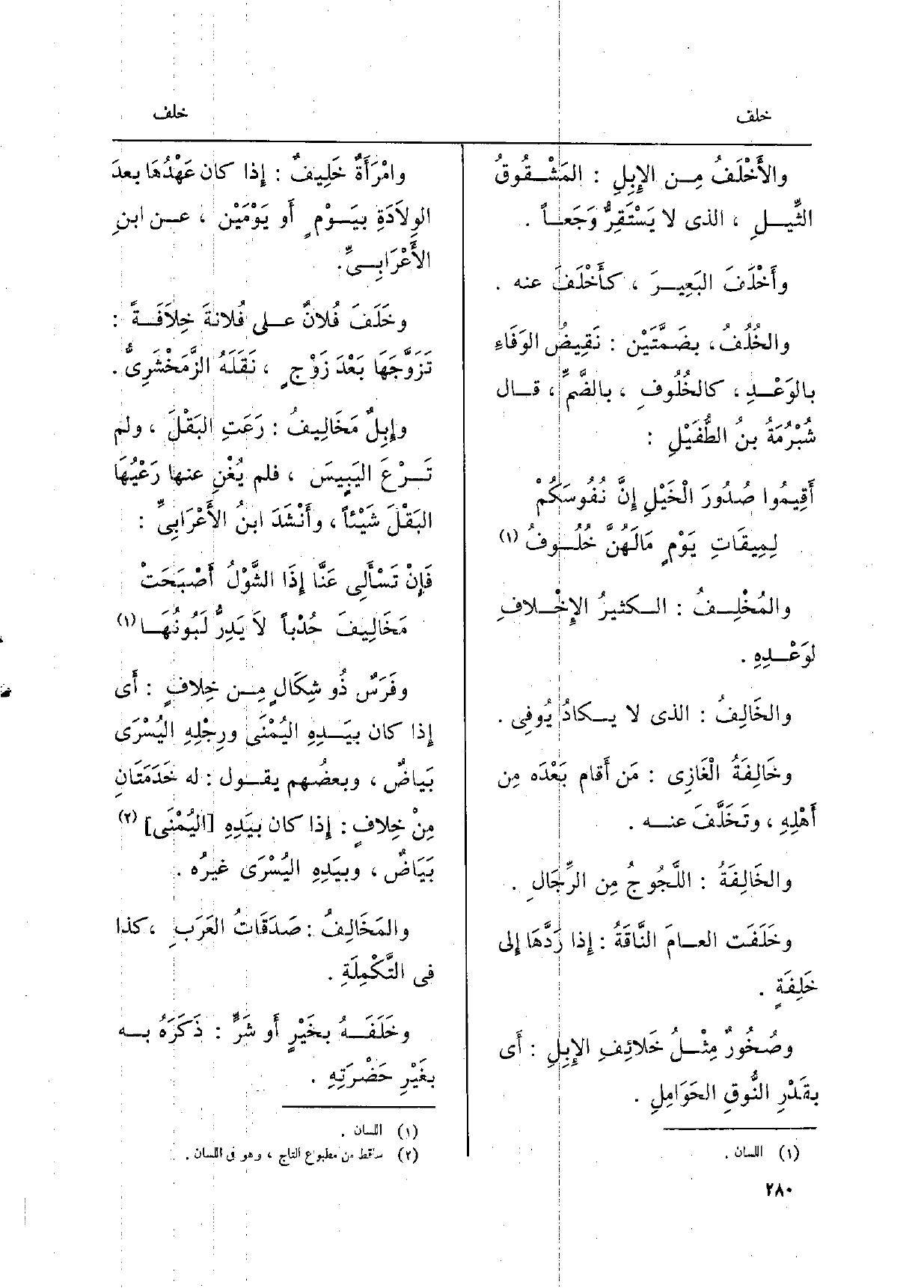 والمُخْلِفُ: الكثيرُ الإِخْلافِ لوَعْدِهِ. والخَالِفُ: الَّذِي لَا يكادُ يُوفِي. وخَالِفَةُ الْغَازِي: مَن بَعْدَه مِن أَهْلِهِ، وتَخَلَّفَ عَنهُ. والخَالِفَةُ: اللَّجُوجُ مِن الرَّجَالِ. وخَلَفَت العامَ النَّاقَةُ: إِذا رَدَّهَا إِلى خَلِفَةٍ.