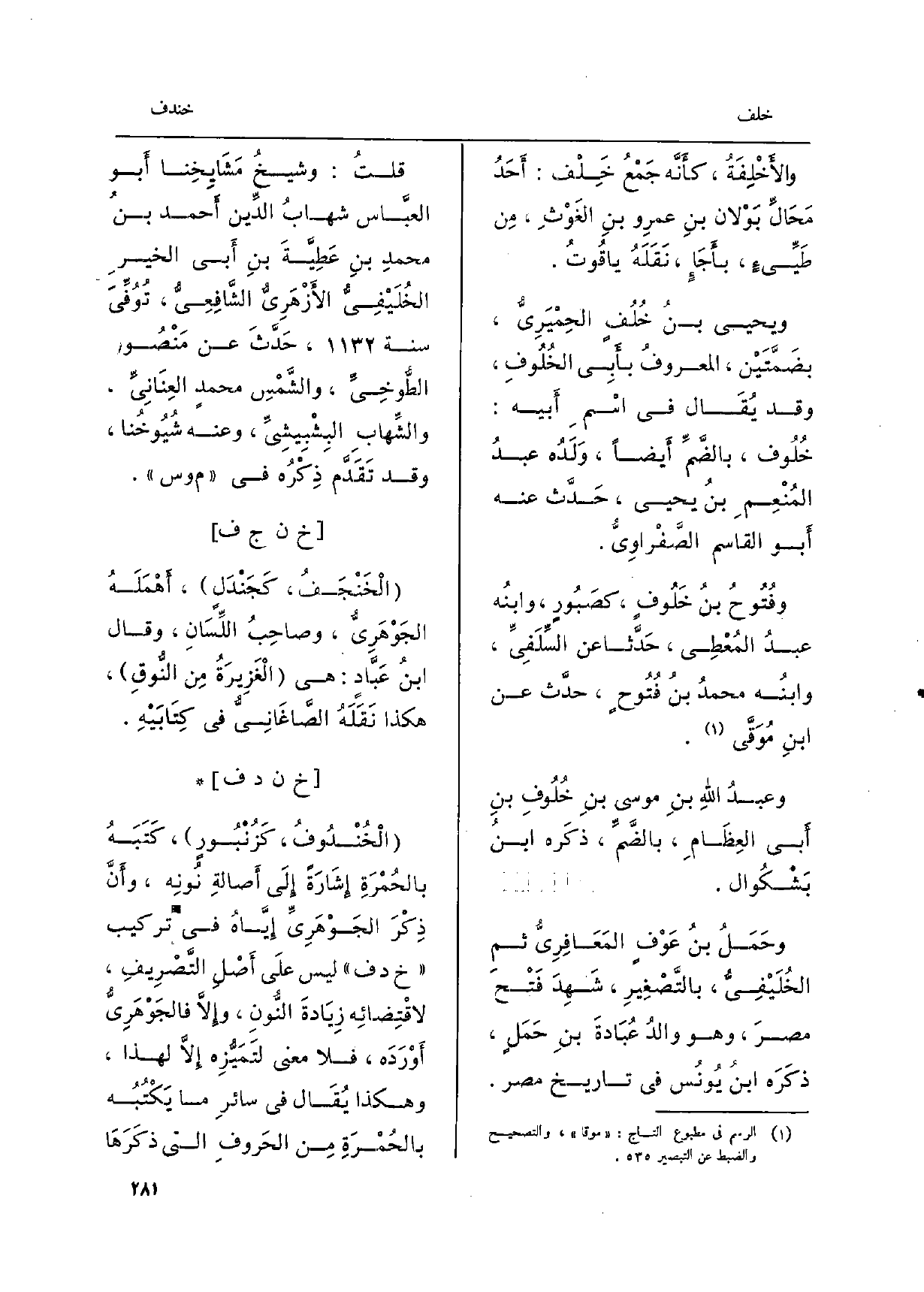 والأَخْلِفَةُ، كأَنَّه جَمْعُ خَلْف: أَحَدُ مَحَالٌ بَوْلان بنِ عمرِو بنِ الغَوْثِ، مِن ضَيِّءِ، بأَجَإٍ، نَقَلَهُ ياقُوتُ. وَيحيى بن بنُ خُلُفٍ الحِمْيَرِيُّ، بضَمَّتَيْن، المعروفُ بأَبِي الخُلُوفِ، وَقد يُقَال فِي اسْمِ أَبيه: خُلُوف، بالضَّمِّ أَيضاً، وَلَدُه عبدُ المُنْعِمِ بنُ يحيى، حَدَّث عَنهُ أَبو الْقَاسِم الصَّفْراوِيُّ. وفُتُوحُ بنُ خَلُوفٍ، كصَبُورٍ، وابنُه عبدُ المُعْطِي، حَدَّثا عَن السِّلَفِيِّ، وابنُه محمدُ بنُ فُتُوحٍ، حدَّث عَن ابنِ مُوَقَّى.