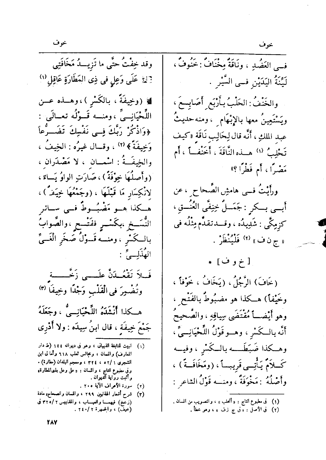 {وخِيفَةً، بالكَسْرِ، وَهَذِه عَن اللِّحْيَانِيِّ، وَمِنْه قَوْلُهُ تعالَى: وْاذْكُرْ رَبَّكَ فِي نَفْسِكَ تَضَرُّعاً وَخِيفَةً، وَقَالَ غيرُه:} الخِيفُ، {والخِيفَةُ، اسْمانِ، لَا مَصْدَرانِ، وأَصلُهَا} خِوْفَةً، صَارَتِ الواوُ يَاءً، لاِنْكِسَارِ مَا قَبْلَهَا، وجَمْعُهَا {خِيَفٌ، هَكَذَا هُوَ مَضْبوطٌ فِي سائرِ النُّسَخِ، بكَسرٍ ففَتْحٍ، والصَّوابُ بالكَسْرِ، وَمِنْه قَوْلُ صَخَرِ الْغَيِّ الهُذَلِيِّ: