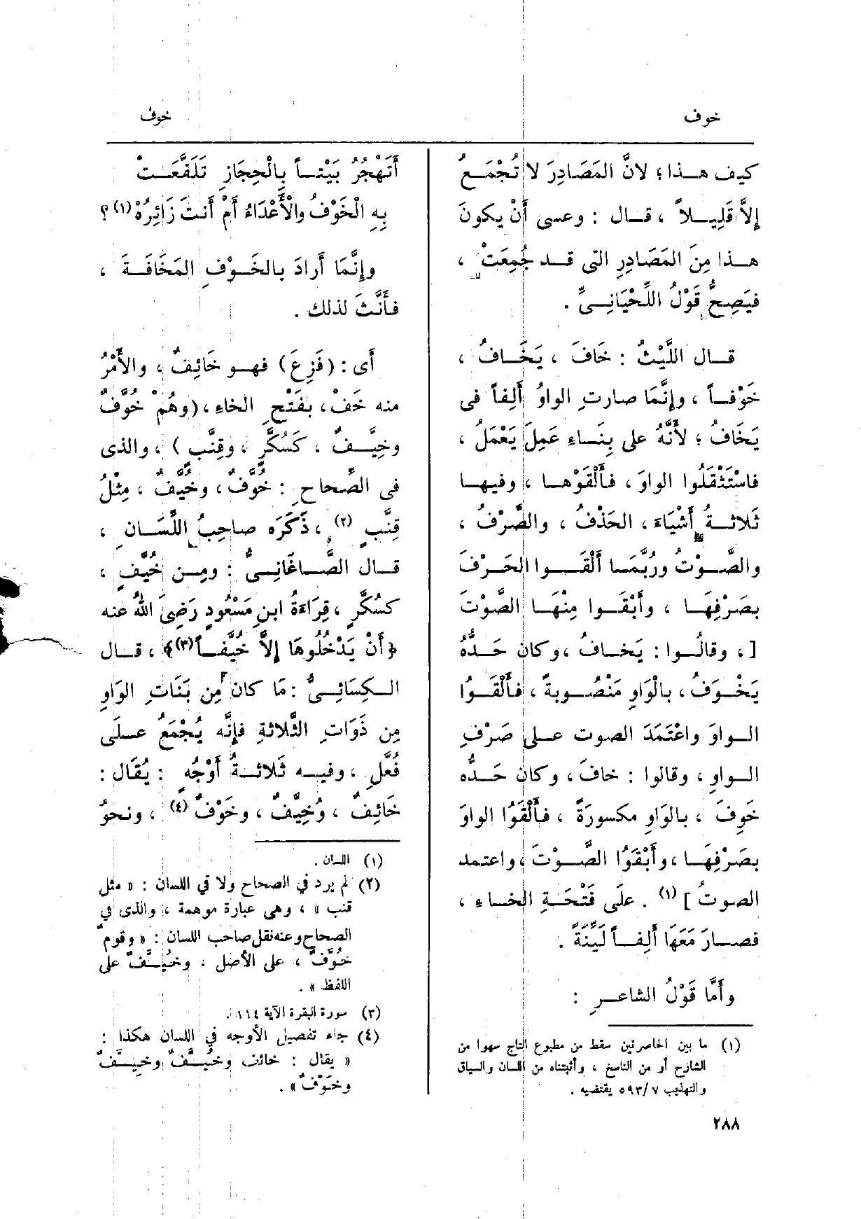 قَالَ اللَّيْثُ: خَافَ، يَخَافُ، خَوْفاً، وإِنَّمَا صارتِ الواوُ أَلِفاً فِي يَخَافُ لأَنَّهُ على بِنَاءِ عَمِلَ يَعْمَلُ، فاسْتَثْقَلُوا الواوَ، فأَلْقَوْها، وفيهَا ثَلاثةُ أَشْيَاءَ، الحَذْفُ، والصَّرْفُ، والصَّوْتُ ورُبَّمَا أَلْقَوا الحَرْفَ بصَرْفِهَا، وأَبْقَوا مِنْهَا الصَّوْتَ، وقالُوا: يَخافُ، وَكَانَ حَدُّهُ {يَخْوَفُ، بالْوَاوِ مَنْصُوبةً، فأَلْقَوُا الواوَ واعْتَمَدَ الصَّوْت على صَرْفِ الواوِ، وَقَالُوا: خافَ، وَكَانَ حَدُّه} خَوِفَ، بالوَاوِ مكسورَةً، فأَلْقَوُا الواوَ بصَرْفِهَا، وأَبْقَوُا الصَّوْتَ، وَاعْتمد الصوتُ. علَى فَتْحَةِ الخاءِ، فصارَ مَعَهَا أَلِفاً لَيِّنَةً. وأَمَّا قَوْلُ الشاعرِ: