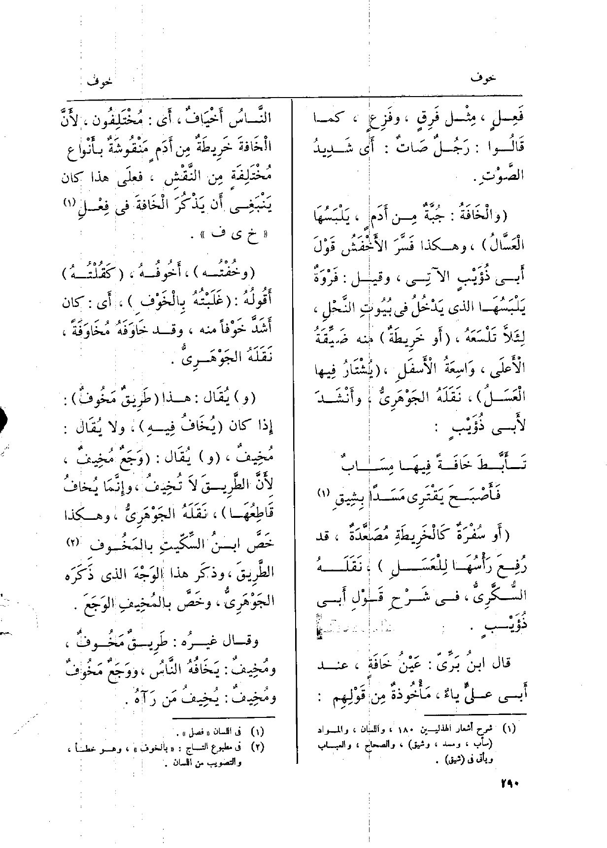فَعِلٍ، مِثْل فَرِقٍ، وفَزِعٍ، كَمَا قَالُوا: رَجُلٌ صَاتٌ: أَي شَدِيدُ الصَّوتِ. {والْخَافَةُ: جُبَّةٌ مِن أّدَمٍ، يَلْبَسُهَا الْعَسَّالُ، وَهَكَذَا فَسَّرَ الأَخْفَشُ قَولَ أَبي ذُؤَيْبٍ الآتِي، وَقيل: فَرْوَةٌ يَلْبَسُهَا الَّذِي يَدْخُلُ فِي بيُوُتِ النَّحْلِ، لِئَلاَّ تَلْسَعَهُ، أَو خَرِيطَةٌ مِنْهُ ضَيِّقَةٌ الأَعلَى، وَاسِعَةُ الأَسفَلِ، يُشْتَارُ فِيها الْعَسَلُ، نَقَلَهُ الجَوْهَريُّ، وأَنشَدَ لأَبي ذُؤَيْبٍ: