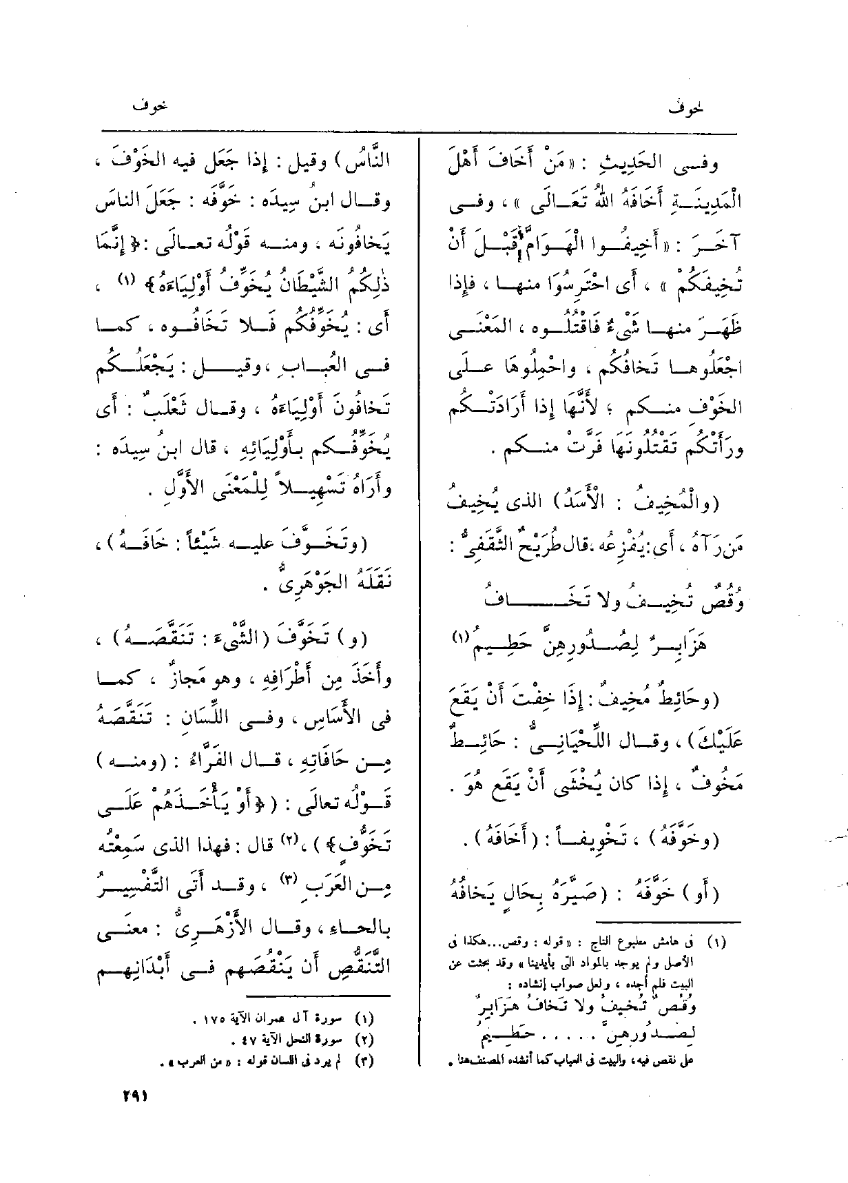 وَفِي الحَدِيثِ:) مَنْ {أَخَافَ أَهْلَ الْمَدِينَةِ} أَخَافَهُ اللُهُ تَعَالَى (، وَفِي آخَرَ:) {أَخِيفُوا الْهَوَامَّ قَبْلَ أَنْ} تُخِيفَكُمْ (، أَي احْتَرِسُوَا مِنْهَا، فإِذا ظَهَرَ مِنْهَا شَيْءٌ فَاقْتُلُوه، المَعْنَى اجْعَلُوها {تَخافُكُم، واحْمِلُوهَا)