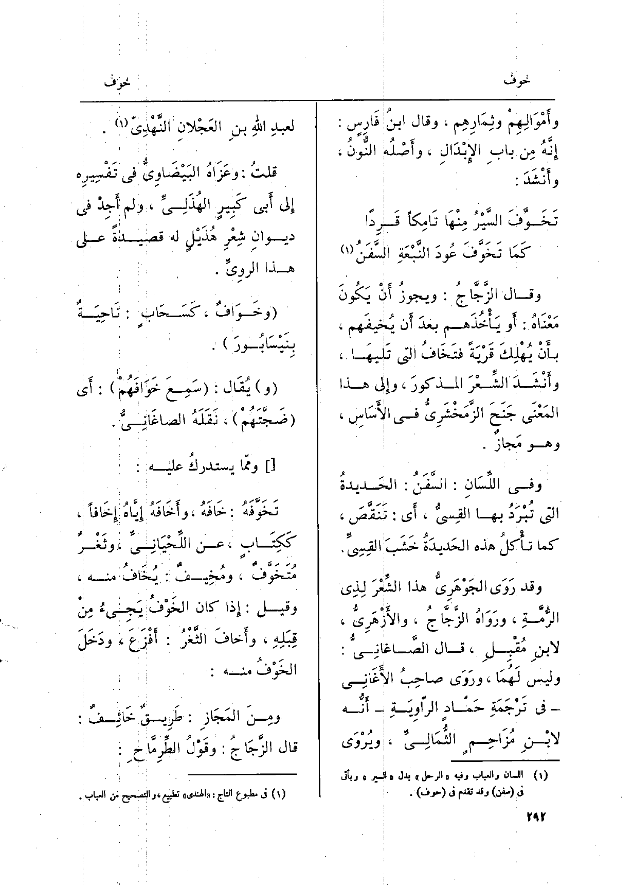 وَقد رَوَى الجَوهَرِيُّ هَذَا الشِّعْرَ لِذِي الرُّمَّةِ، ورَوَاهُ الزَّجَّاجُ، والأَزْهَرِيُّ، لابنِ مُقْبِلِ، قَالَ الصَّاغانِيُّ: وَلَيْسَ لَهُمَا، وَروَى صاحِبُ الأَغَانِي فِي تَرْجَمَةِ حَمّادٍ الرّاوِيَةِ أَنُّه لابْنِ مُزَاحِمٍ الثُّمَالِيِّ، ويُرْوَى لعبدِ الليثِ بنِ العَجْلانِ النَّهْدِيّ. قلتُ: وعَزَاهُ البَيْضَاوِيُّ فِي تَفْسِيرِه إِلى أَبي كَبِيرٍ الهُذَلِيِّ، وَلم أَجِدْ فِي ديوَان شِعْرِ هُذَيْلٍ لَهُ قصيدةً على هَذَا الروِيِّ.} وخَوَافٌ، كَسَحَابٍ: نَاحِيَةٌ بِنَيْسَابُورَ. يُقَال: سَمِعَ {خَوَافَهُمْ: أَي ضَجَّتَهُمْ، نَقَلَهُ الصاغَانِيُّ. وممّا يستدركُ عَلَيْهِ:} تَخَوَّفَهُ: {خَافَهُ،} وأَخَافَهُ إِيَّاهُ {إِخَافاً، كَكِتَابٍ، عَن اللِّحْيَانِيُّ، وثَغْرٌ مُتَخَوَّفٌ، ومُخِيفٌ:} يُخَافُ مِنْهُ، وَقيل: إِذا كَانَ الخَوْفُ يَجِيءُ مِنْ قِبَلِهِ، {وأَخافَ الثَّغْرُ: أَفزَعَ، ودَخَلَ الخَوْفُ مِنْهُ: ومِنَ المَجَازِ: طَرِيقٌ} خَائِفٌ: قَالَ الزَّجَاجُ: وقَوْلُ الطِّرِمَّاحِ: