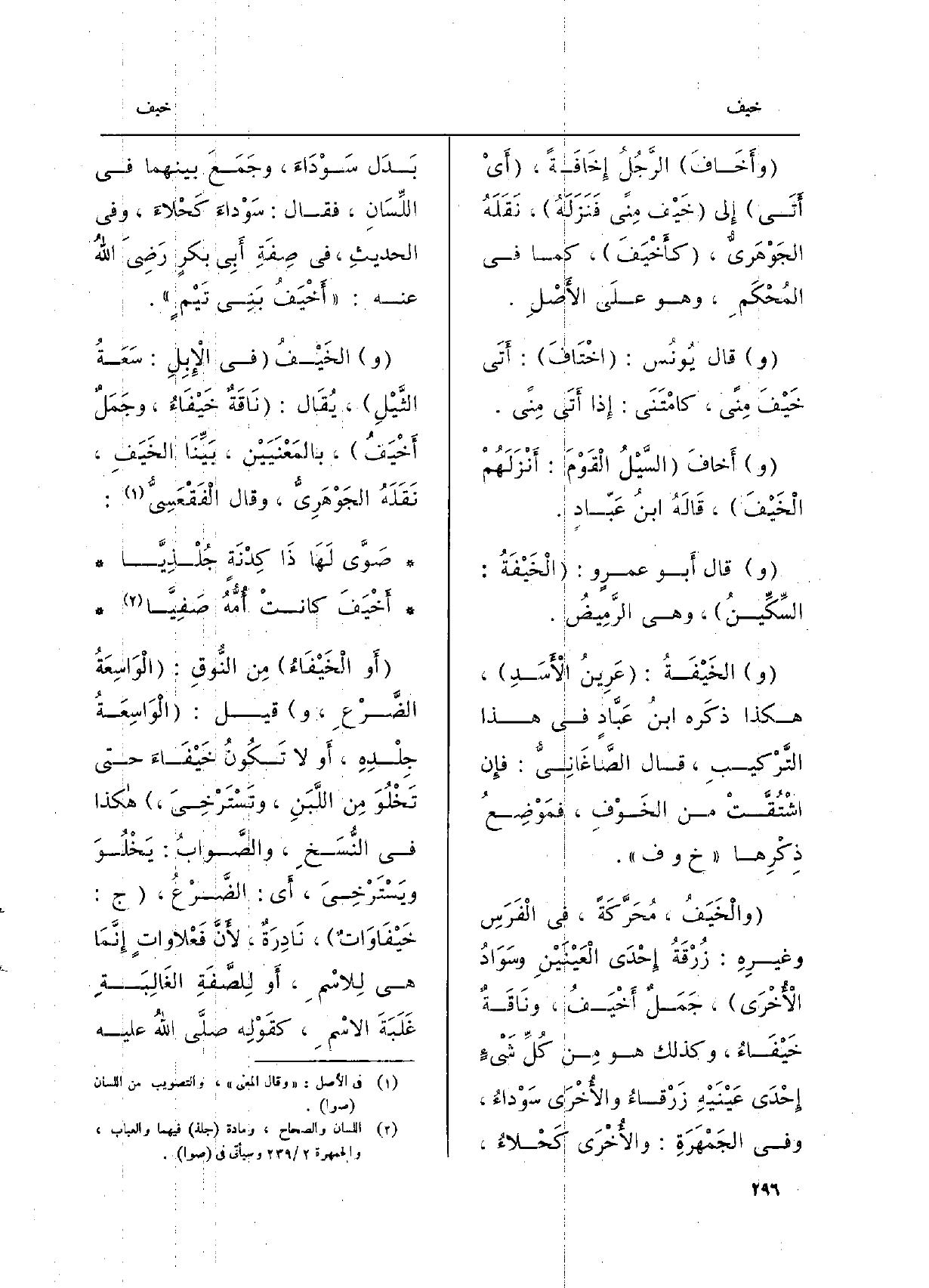 } والْخَيَفُ، مُحَرَّكَةً، فِي الْفَرَسِ وغيرِهِ: زُرْقَةُ إِحْدَى الْعَيْنَيْنِ وسَوَادُ الأُخْرَى، جَمَلُ {أَخْيَفُ، ونَاقَةٌ} خيْفَاءُ، وَكَذَلِكَ هُوَ مِن كُلِّ شَيْءٍ إِحْدَى عَيْنَيْهِ زَرْقَاءُ والأُخْرَى سَوْداءُ وَفِي الجَمْهَرَةِ: والأُخْرَى كَحْلاءُ، بَدَلْ سَوْدَاءَ، وجَمَعَ بَينهمَا فِي اللِّسَانِ، فَقَالَ: سَوْداءِ كَحْلاءَ، وَفِي الحديثِ، فِي صِفَةِ أَبِي بكرٍ رَضيَ اللهُ عَنهُ:) أَخْيَفُ بَنِي تَيْمِ (. الخَيْفُ فِي الإِبِلِ: سَعَةُ الثَّيْلِ، يُقَال: نَاقَةٌ {خَيْفَاءُ، وجَمَلٌ أَخْيَفُ، بالمَعْنَيَيْنِ، بَيِّنَا الخَيَفِ، نَقَلَهُ الجَوْهَرِيُّ، وَقَالَ الْفَقْعَسِيُّ: صَوَّى لَهَا ذَا كِدْنَةٍ جُلْذِيَّا} أَخْيَفَ كانتْ أُمُّهُ صَفِيَّا أَو {الخَيْفَاءُ مِن النُّوْقِ: الْوَاسِعَةُ الضَّرْعِ، قيل: الْوَاسِعَةُ جِلْدِهِ، أَو لَا تَكُونُ خَيْفَاءَ)