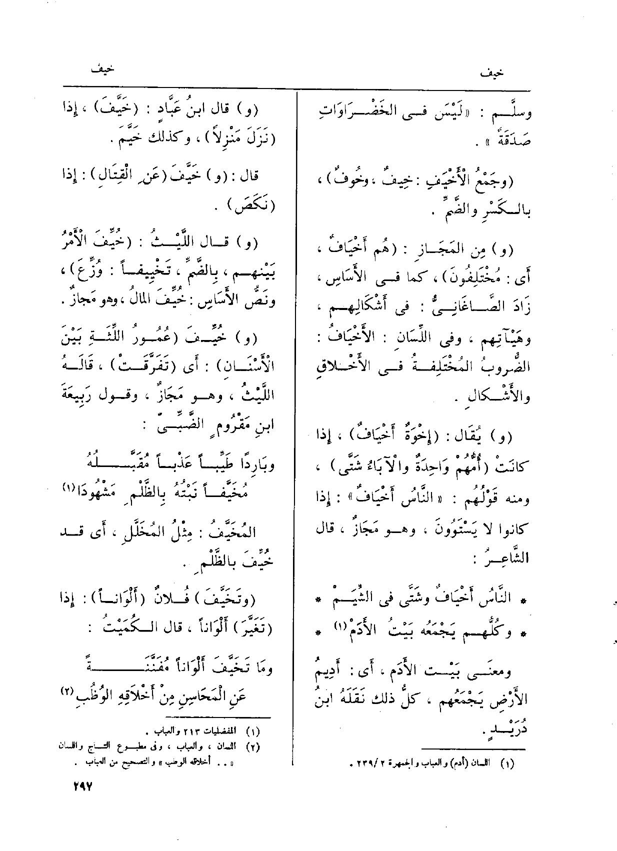وسَلَّم:) لَيْسَ فِي الخَضْرَاوَاتِ صَدَقَةٌ (. وجَمْعُ {الأَخْيَفِ:} خِيفٌ، {وخُوفٌ، بالكَسْرِ والضَّمِّ. مِن المَجَازِ: هُم} أَخْيَافٌ، أَي: مُخْتَلِفُونَ، كَمَا فِي الأَسَاسِ، زَادَ الصَّاغَانِيُّ: فِي أَشْكَالِهم، وهَيْآتِهم، وَفِي اللِّسَانِ: {الأَخْيَافُ: الضُّروبُ المُخْتَلِفَةُ فِي الأَخْلاقِ والأَشْكالِ. يُقَال: إِخْوَةٌ أَخْيَافٌ، إِذا كانَتْ أُمُّهُمْ وَاحِدَةٌ والآبَاءُ شَتَّى، وَمِنْه قَوْلُهُم:) الناسُ أَخْيَافٌ (: إِذا كَانُوا لَا يَسْتَوُونَ، وَهُوَ مَجَازٌ، قَالَ الشَّاعِرُ: النَاسُ أَخْيَافٌ وشَتَّى فِي الشِّيَمْ وكُلُّهم يَجْمَعُه بَيْتُ الأَدَمْ ومعنَى بَيْتُ الآَدَم، أَي: أَدِيمُ الأَرْضِ يَجْمَعُهم، كلُّ ذَلِك نَقَلَهُ ابنُ دُرَيْدٍ. قَالَ ابنُ عَبَّادٍ:} خَيَّفَ، إِذا نَزَلَ مَنْزِلاً، وَكَذَلِكَ خَيَّمَ. قَالَ: {خَيَّفَ الأَمْرُ بَيْنهم، بِالضَّمِّ،} تَخْيِيفاً: وُزِّعَ، ونَصَّ الأَسَاس: خُيِّفَ المالُ، وَهُوَ مَجازٌ. خُيِّفَ عُمُورُ اللِّثَةِ بَيْنَ الأَسْنَانِ: أَي تَفَرَّقَتْ، قَالَهُ اللَّيْثُ، وَهُوَ مَجَازُ، وَقَول رَبِيعَةَ ابنِ مَقْرُومٍ الضَّبِّيّ: