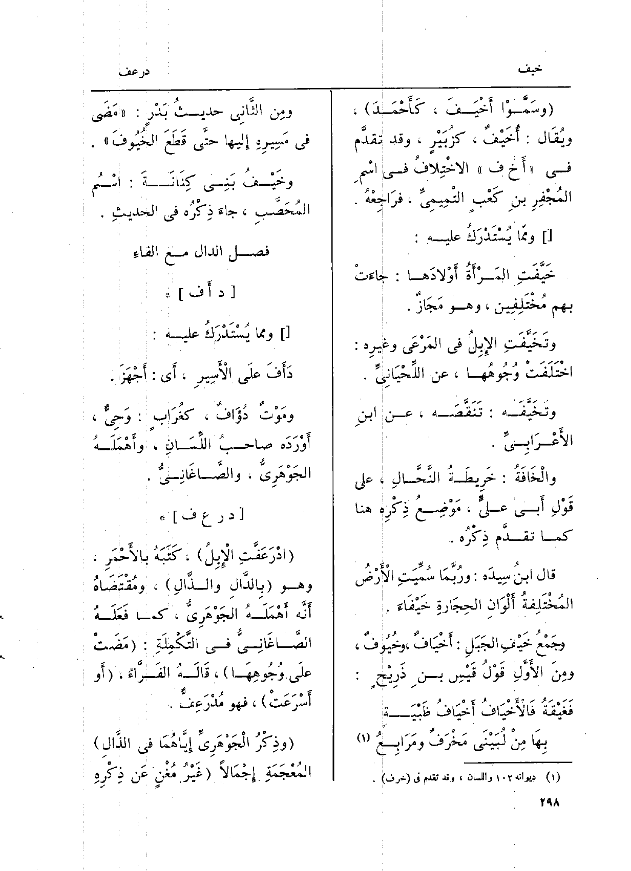 ومِن الثَّانِي حديثُ بَدْرٍ: مَضَى فِي مَسِيرِهِ إِليها حتَّى قَطَعَ} الخُيُوفَ. {} وخَيْفُ بَنِى كِنَانَةَ: اسْمُ المُحَصَّبِ، جاءَ ذِكْرُه فِي الحديثِ.)
