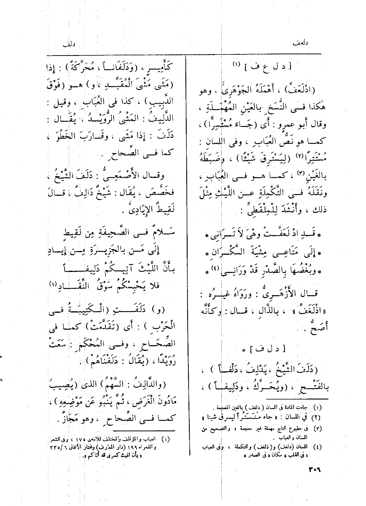 ادْلَعَفَّ، أَهْمَلَهُ الجَوْهَريُّ، وَهُوَ هَكَذَا فِي النُّسَخِ بالعَيْنِ المُهْمَلَةِ، وَقَالَ أَبو عمرٍ و: أَي جَاءَ مُسْتَسِرَّاً، كَمَا هُوَ نَصُّ العُبَابِ، وَفِي اللسانِ: مُسْتَتِراً لِيَسْتَرقَ شَيئاً، وضَبَطَهُ بالغَيْنِ، كَمَا هُوَ فِي العُبَابِ، ونَقَلَهُ فِي التَّكْمِلَةِ عَن اللَّيْثِ مِثْلَ ذَلِك، وأَنْشَدَ لِلْمِلْقَطِيِّ: قَدِ ادْلَعَفَّتْ وهْيَ لاَ تَرَانِي إِلَى مَتَاعِي مِشْيَةَ السَّكْرَانِ وبغْضُهَا بِالصَّدْرِ قَدْ وَرَانِي قَالَ الأَزْهَريُّ: ورَواهُ غيرُه: اذْلَغَفَّ، بالذّالِ، قَالَ: وكأَنَّه أَصَحُّ.