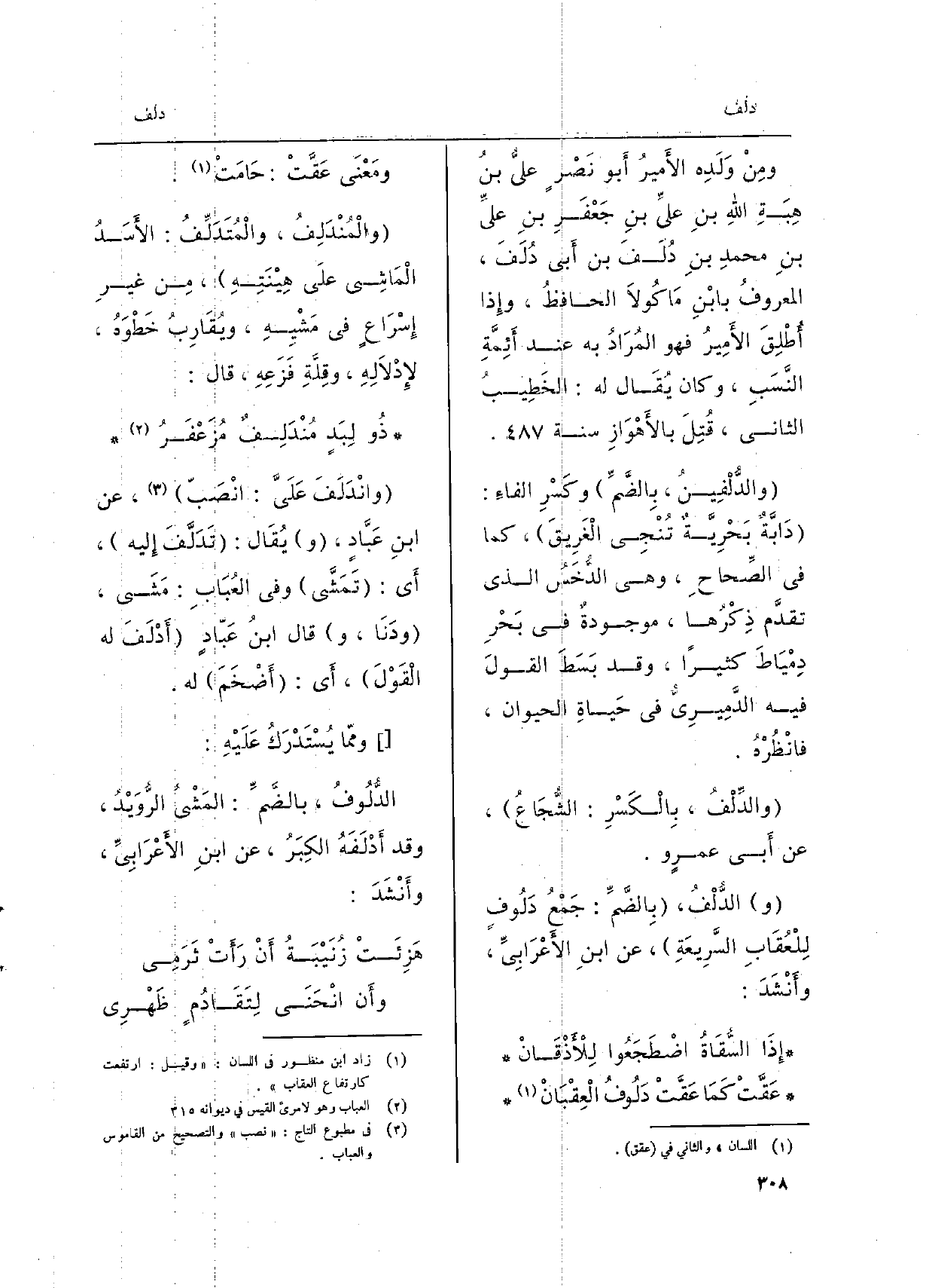 ومِنْ وَلَدِه الأَميرُ أَبو نَصْرٍ عليُّ بنُ هِبَةِ اللهِ بنِ عليِّ بنِ جَعْفَرِ بنِ عليِّ بنِ محمدِ بنِ دُلَفَ بن أَبي دُلَفَ، المعروفُ بابْنِ مَاكُولاَ الحافظُ، وإِذا أُطْلِقَ الأَمِيرُ فَهُوَ المُرَادُ بِهِ عِنْد أَئِمَّةِ النَّسَبِ، وَكَانَ يُقَال لَهُ: الخَطِيبُ الثَّانِي، قُتِلَ بالأَهْوَازِ سنة. والدُّلْفِينُ، بِالضَّمِّ وكَسْرِ الفاءِ: دَابَّةٌ) بَحْرِيَّةٌ تُنْجِي الغَرِيقَ، كَمَا فِي الصِّحاحِ، وَهِي الدُّخَسُ الَّذِي تقدَّم ذِكْرُها، موجودةٌ فِي بَحْرِ دِمْيَاطَ كثيرا، وَقد بَسَطَ القولَ فِيهِ الدَّميرِيُّ فِي حَياةِ الْحَيَوَان، فانْظُرْهُ. والدِّلْفُ، بِالْكَسْرِ: الشُّجَاعُ، عَن أَبي عمرٍ و. الدُّلْفُ، بِالضَّمِّ: جَمْعُ دَلُوفٍ لِلْعُقَابِ السَّرِيعَةِ، عَن ابنِ الأَعْرَابيِّ، وأَنْشَدَ: إِذَا السُّقَاةُ اضْطَجَعُوا للأَذْقَانْ عَقَّتْ كَمَا عَقَّتْ دَلُوفُ الْعِقْبَانْ ومَعْنَى عَقَّتْ: حَامَتْ. والْمُنْدَلِفُ، والْمُتَدَلِّفُ: الأَسَدُ الْمَاشِي علَى هِيْنَتِهِ، مِن غيرِ إِسْرَاعٍ فِي مَشْيِهِ، ويُقَارِبُ خَطْوَهُ، لإِدْلاَلِهِ، وقِلَّةِ فَزَعِهِ، قَالَ: ذُو لَبِدٍ مُنْدَلِفٌ مُزَعْفَرُ وانْدَلَفَ عَلَىَّ: انْصَبّ، عَن ابنِ عَبَّادٍ، يُقَال: تَدَلَّفَ إِليه، أَي: تَمَشَّى وَفِي العُبَابِ: مَشَى، ودَنَا، قَالَ ابنُ عَبّادٍ أَدْلَفَ لَهُ الْقَوْلَ، أَي: أَضْخَمَ لَهُ. وممّا يُسْتَدْرَكُ عَلَيْهِ: الدُّلُوفُ، بالضَّمِّ: المَشْيُّ الرُّوَيْدُ، وَقد أَدْلَفَهُ الكِبَرُ، عَن ابنِ الأَعْرَابِيِّ، وأَنشَدَ: