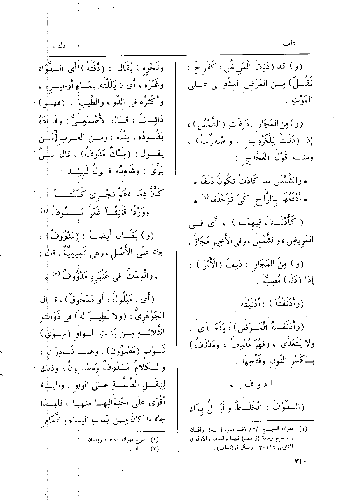 يُقَال أَيضاً: مَدْوُوفٌ، جاءَ علَى الأَصْلِ، وَهِي تَمِيمِيَّةٌ، قَالَ: والْمِسْكُ فِي عَنْبَرِهِ مَدْوُوفُ أَي: مَبْلُولٌ، أَو مَسْحوقٌ، قَالَ الجَوْهَرِيُّ: وَلَا نَظِيرَ لَهُ فِي ذَوَاتِ الثَّلاثةِ مِن بَناتِ الواوِ سِوَى ثَوْبٍ مَصْوُونٍ، وهما نَادِرَانِ، والكلامُ مَدُوفٌ وَمصُونٌ، وَذَلِكَ لِثِقَلِ الضَّمَّةِ على الواوِ، والياءُ أَقْوَى علَى احْتِمَالِها مِنْهَا، فَلهَذَا جاءَ مَا كانَ مِن بَناتِ الياءِ بالتَّمَام