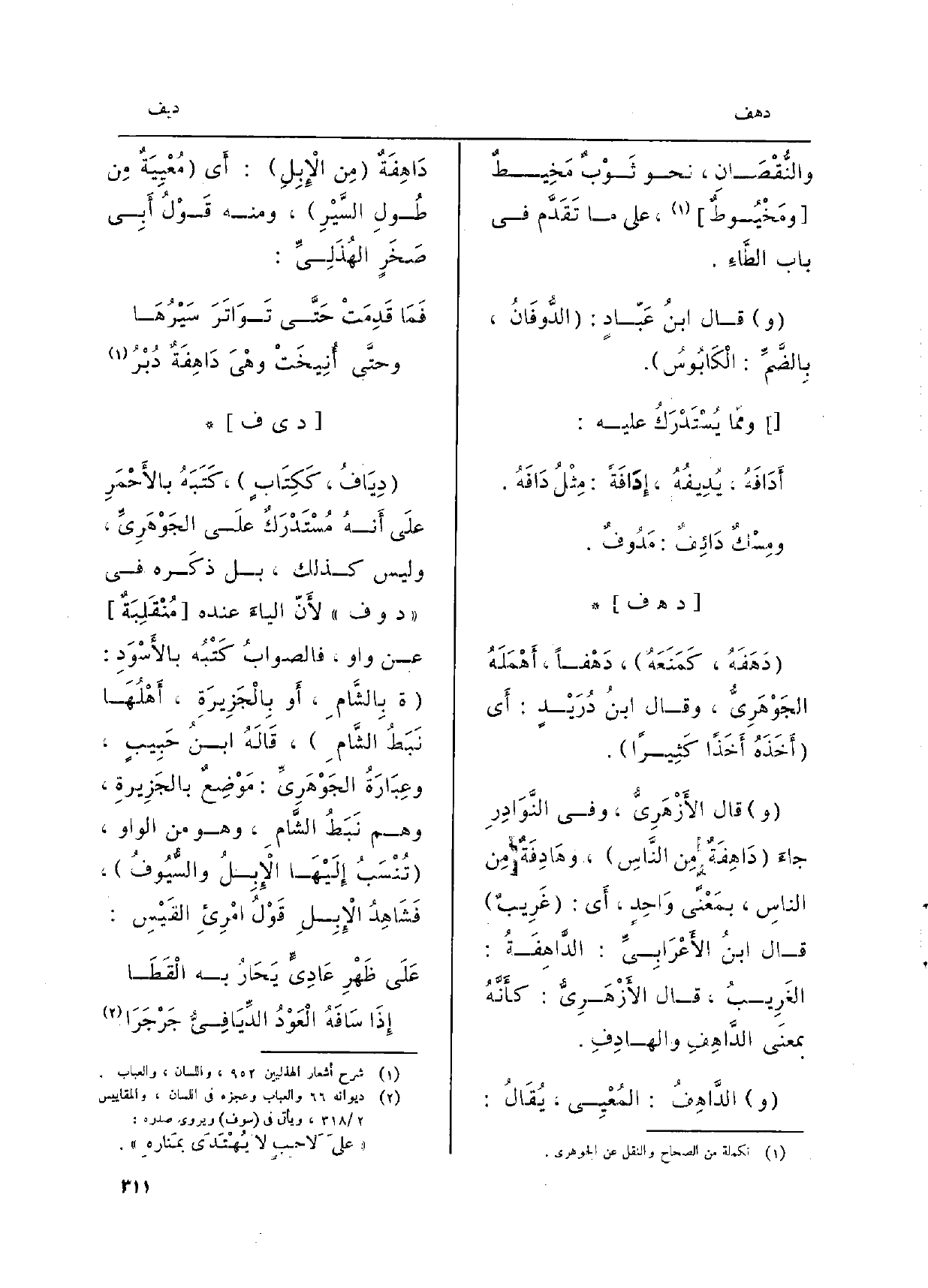 الدَّاهِفُ: المُعْيِي، يُقَالُ: دَاهِفَةٌ مِن الإِبِلِ: أَي مُعْيِيَةٌ مِن طُولِ السَّيْرِ، وَمِنْه قَوْلُ أَبِي صَخَرٍ الهّذَلِيِّ: