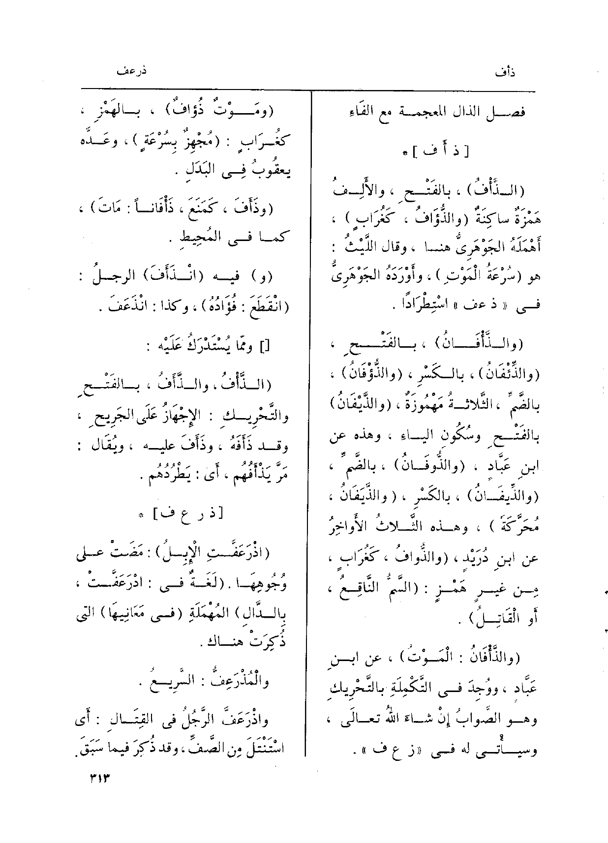 اذْرَعَفَّتِ الإِبِلُ: مَضَتْ على وُجُوْهِهَا. لَغَةٌ فِي: ادْرَعَفَّتْ، بِالدَّالِ المُهْمَلَةِ فِي مَعَانِيهَا الَّتِي ذُكِرَتْ هُنَاكَ. والْمُذْرَعِفُّ: السَّرِيعُ. واذْرَعَفَّ الرَّجُلُ فِي القِتَالِ: أَي اسْتَنْتَلَ مِنْ الصَّفِّ، وَقد ذُكِرَ فِيمَا سَبَقَ.