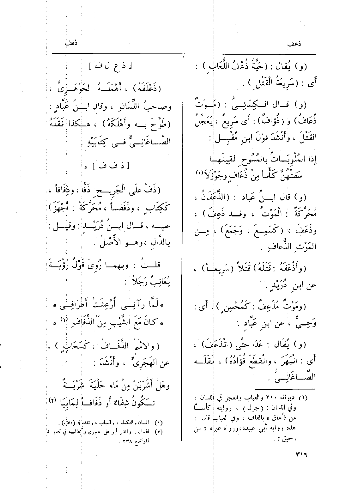 يُقَالُ: حَيَّةٌ ذُعْفُ اللُّعَابِ: أَي: سَرِيعَةُ الْقَتْلِ. قَالَ الكِسَائِيُّ: مَوْتٌ ذُعَافٌ وذُؤافٌ: أَي سَرِيعٌ، يُعَجَّلُ القَتْلَ، وأَنْشَدَ قوْلَ ابنِ مُقْبِل: