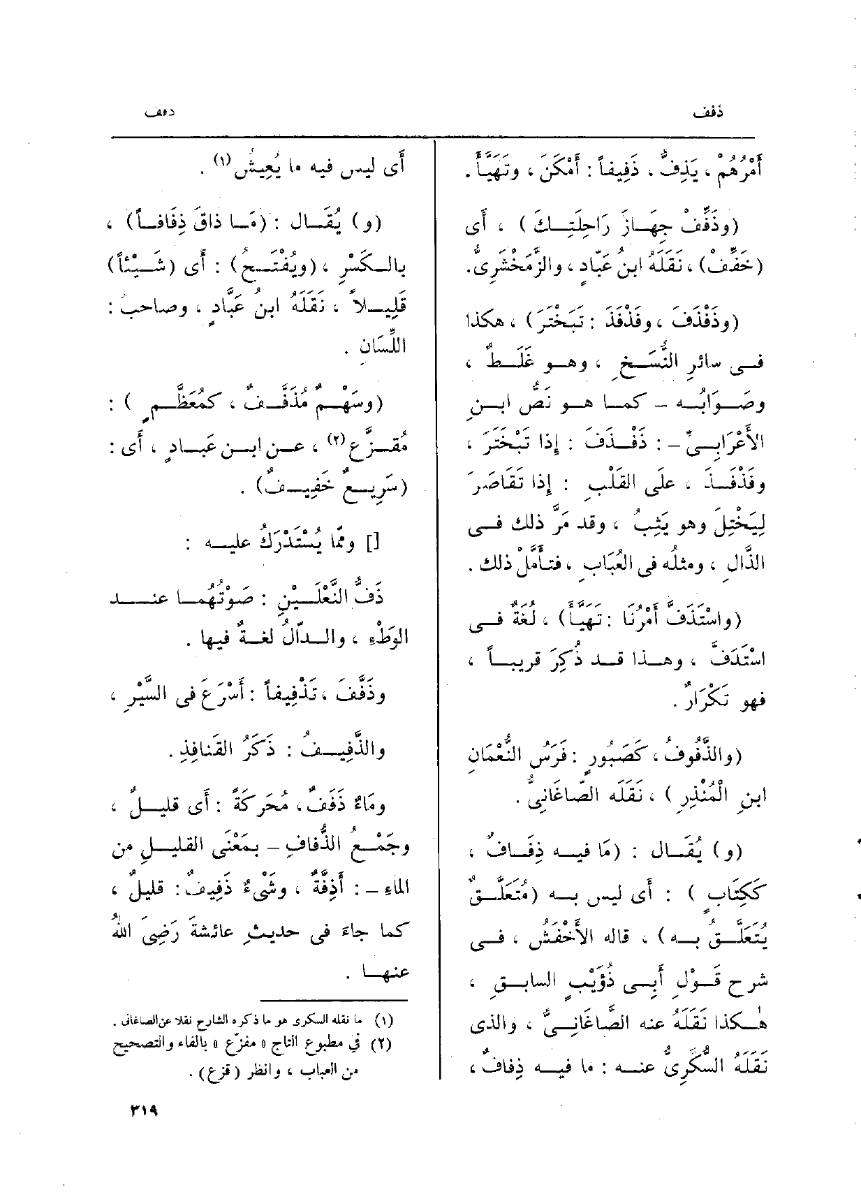 أَمْرُهُمْ، {يَذِفُّ،} ذَفِيفاً: أَمْكَنَ، وتَهَيَّأَ. {وذَفِّفْ جِهَازَ رَاحِلَتِكَ، أَي خَفِّفْ، نَقَلَهُ ابنُ عُبّادٍ، والزَّمَخْشَرِيُّ.} وذَفْذَفَ، وفَذْفَذَ: تَبَخْتَرَ، هَكَذَا فِي سائرِ النُّسَخِ، وَهُوَ غَلَطٌ، وصَوَابُه كَمَا هُوَ نَصُّ ابنِ الأَعْرَابِيِّ: {ذَفْذَفَ: إِذا تَبْخَتَرَ، وفَذْفَذَ، علَى القَلْبِ: إِذا تَقَاصَرَ لِيَخْتِلَ وَهُوَ يَثِبُ، وَقد مَرَّ ذَلِك فِي الذَّالِ، ومثلُه فِي العُبَابِ، فتأَمَّلْ ذَلِك.} واسْتَذَفَّ أَمْرُنَا: تَهَيَّأَ، لُغَةٌ فِي اسْتَدَفَّ، وَهَذَا قد ذُكِرَ قَرِيبا، فَهُوَ تَكْرَارٌ {والذَّفُوفُ، كَصَبُورٍ: فَرَسُ النُّعْمَانِ ابنِ الْمُنْذِرِ، نَقَلَه الصّاغَانِيُّ. يُقَال: مَا فِيهِ} ذِفَافٌ، كَكِتَابٍ: أَي لَيْسَ بِهِ مُتَعَلَّقٌ يُتَعَلَّقُ بِهِ، قَالَه الأَخْفَشُ، فِي شرح قَوْلِ أَبِي ذُؤَيْبٍ السابقِ، هَكَذَا نَقَلَهُ عَنهُ الصَّاغَانِيُّ، وَالَّذِي نَقَلَه السُّكَّرِيُّ عَنهُ: مَا فِيهِ ذِفافٌ، أَي لَيْسَ فِيهِ مَا يُعِيشُ. يُقَال: مَا ذاقَ {ذِفَافاً، بالكَسْرِ، ويُفْتَحُ: أَي شَيْئاً قَلِيلاً، نَقَلَهُ ابنُ عَبَّادٍ، وصاحبُ اللِّسَانِ. وسَهْمٌ} مُذَفَّفٌ، كمُعَظَّمٍ: مُقزَّع، عَن ابْن عَبادٍ، أَي: سَرِيعٌ خَفِيفٌ. وممّا يُسْتَدْرَكُ عَلَيْهِ: ذَفُّ النَّعْلَيْنِ: صَوْتُهُما عِنْد الوَطْءِ، والدّالُ لغةٌ فِيهَا. {وذَفَّفَ،} تَذْفِيفاً: أَسْرَعَ فِي السَّيْرِ، والذَّفِيفُ: والذَّفِيفُ: ذَكَرُ القَنافِذِ. ومَاءٌ {ذَفَفٌ، مُحرَكَةً: أَي قليلٌ، وجَمْعُ الذُّفافِ بمَعْنَى القليلِ من الماءِ: أَذِفَّةٌ، وشَيْءٌ} ذَفِيفٌ: قليلٌ، كَمَا جاءَ فِي حديثِ عائشةَ رَضِيَ اللهُ عَنْهَا.