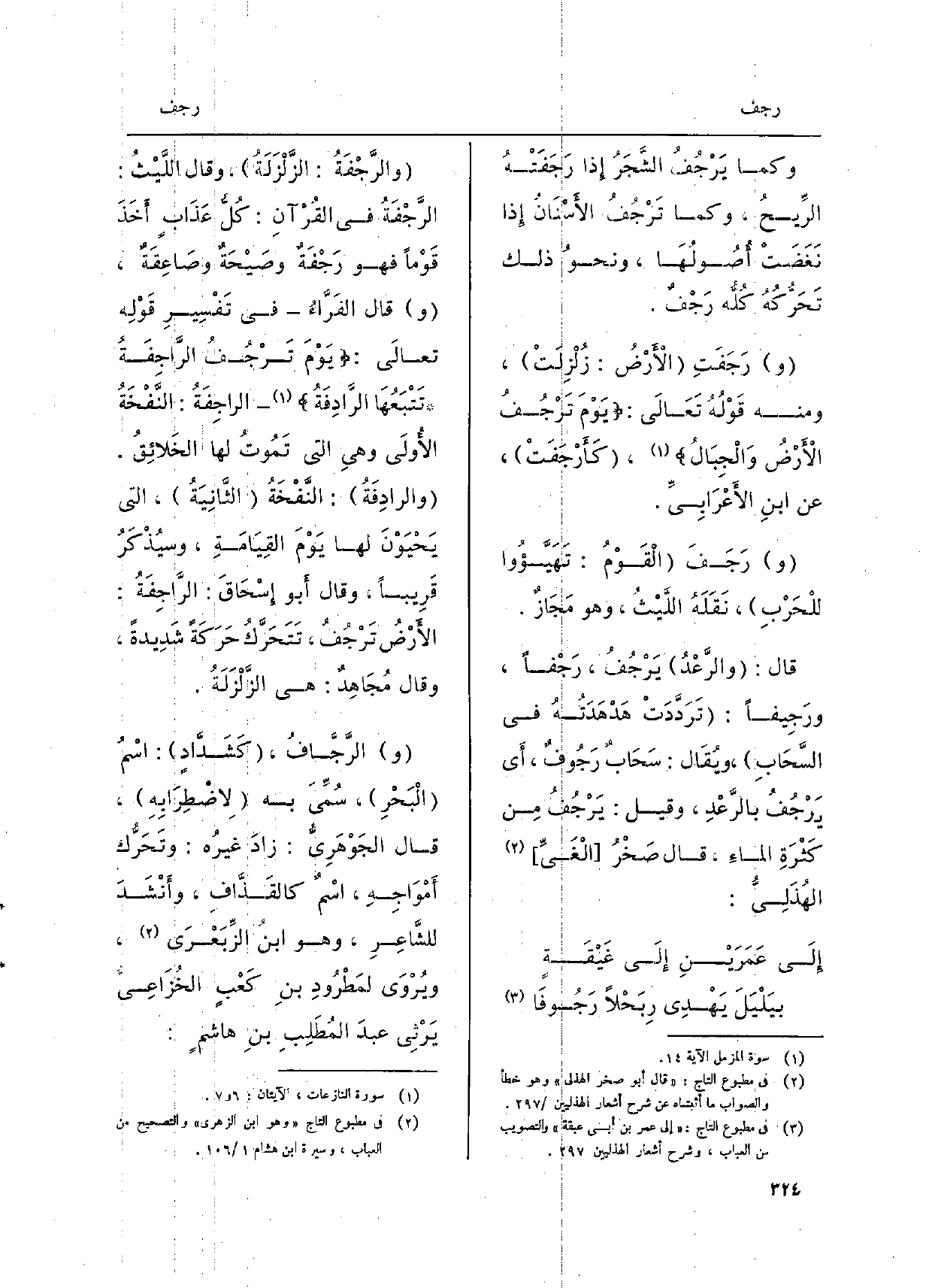 والرَّجْفَةُ: الزَّلْزَلَةُ، وَقَالَ اللَّيْثُ: الرَّجْفَةُ فِي القُرْآنِ: كُلُّ عّذَابٍ أَخَذَ قَوْماً فَهُوَ رَجْفَةٌ وصَيْحَةٌ وصَاعِقَةٌ، قَالَ الفَرَّاءُ فِي تَفْسِيرِ قَوْلِهِ تعالَى:) يَوْمَ تَرْجُفُ الرَّاجِفَةُ تَتْبَعُهَا الرَّادِفَةُ (الراجِفَةُ: النَّفْخَةُ الأُولَى وَهِي الَّتِي تَمُوتُ لَهَا الخَلائِقُ. والرادِفَةُ: النَّفْخَةُ الثَّانِيَةُ، الَّتِي يَحْيُوْنُ لَهَا يَوْمَ القِيَامَةِ، وسيُذْكَرُ قَرِيباً، وَقَالَ أَبو إِسْحَاقَ: الرَّاجِفَةُ: الأَرْضُ تَرْجُفُ، تَتَحَرَّكُ حَرَكَةً شَدِيدةً، وَقَالَ مُجَاهِدٌ: هِيَ الزَّلْزَلَةُ. الرَّجَّافُ، كَشَدَّادٍ: اسْمُ الْبَحْرِ، سُمِّيَ بِهِ لاِضْطِرَابِهِ، قَالَ الجَوْهَرِيُّ: زادَ غيرُه: وتَحَرُّك أَمْوَاجِهِ، اسْمٌ كالقَذَّافِ، وأَنْشَدَ للشَّاعِرِ، وَهُوَ ابنُ الزِّبَعْرَي، ويُرْوَى لمَطْرُودِ بنِ كَعْبٍ الخُزَاعِي يَرْثِي عبدَ المُطَلِبِ بنِ هاشمٍ: