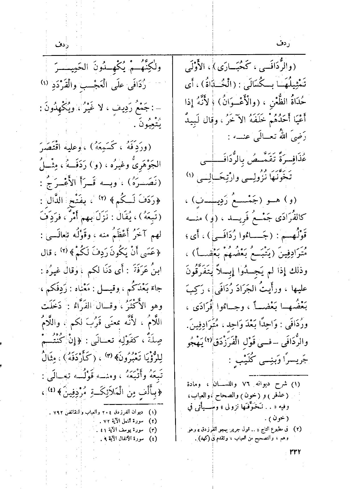 جَمْعُ رَدِيفٍ، لَا غَيْرُ، ويُكْهِدُونَ: يُتْعِبُونَ. ورَدِفَهُ، كَسَمِعَهُ، وَعَلِيهِ اقْتَصَرَ الجَوْهَريُّ وغيرُه، رَدَفَهُ، مِثْلُ نَصَرَهُ، وَبِه قَرَأَ الأَعْرَج:) رَدَفَ لَكُمْ (بفَتْحِ الدَّالِ: تَبِعَهُ، يُقَال: نَزَلَ بهم أَمْرٌ، فرَدِفَ لَهُم آخَرُ أَعْظَمُ مِنْهُ، وقَوْلُه تعالَى:) عَسَى أَنْ يَكُونَ رَدِفَ لَكُمْ (، قَالَ ابنُ عَرَفَةَ: أَي دَنَا لكم، وَقَالَ غيرُه: جاءَ بَعْدَكُم، وَقيل: مَعْناه: رَدِفَكم، وَهُوَ الأَكْثَرُ، وَقَالَ الفَرَّاءُ: دَخَلَت اللاَّمُ، لأَنَّه بمعنَى قَرُبَ لكم، واللامُ صِلَةٌ، كقَوْلِه تعالَى:) إِنْ كُنْتُمْ لِلرُّؤْيَا تَعْبُرُونَ (، كَأَرْدَفَهُ، مِثَالُ تَبِعَهُ وأَتْبَعُهُ، وَمِنْه قَوْلَهُ تعالَى:) بِأَلْفٍ مِن الْمَلاَئِكَةِ مُرْدِفِين (،