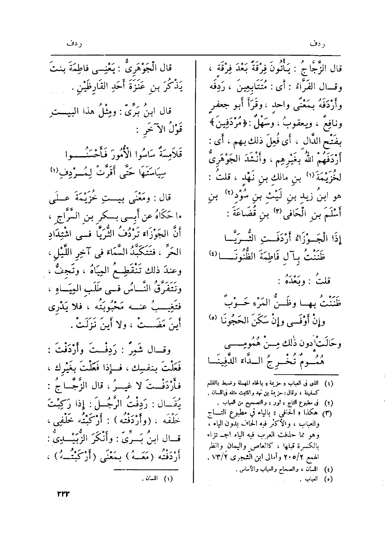 قَالَ: ومَعْنَى بيتِ خُزَيْمَةَ علَى مَا حَكَاهُ عَن أَبِي بكرِ بنِ السَّرَّاجِ، أَنَّ الجَوْزَاءَ تَرْدُفُ الثُّرَيَّا فِي اشْتِدَادِ الحَرِّ، فتَتَكَبَّدُ السَّمَاءَ فِي آخِرِ اللَّيْلِ، وعندَ ذَلِك تَنْقَطِعُ المِيَاهُ، وتَجِفُّ، وتَتَفَرَّقُ النَّاسُ فِي طَلَبِ المِيَاهِ، فتَغِيبُ عَن مَحْبُوبَتُه، فَلَا يَدْرِي أَينَ مَضَتْ، وَلَا أَينَ نَزَلَتْ. وَقَالَ شَمِرٌ: رَدِفْتَ وأَرْدَفْتَ: فَعَلْتَ بنفسِك، فإِذا فَعَلْتَ بغَيْرِك، فأَرْدَفْتَ لَا غيرُ، قَالَ الزَّجَّاجُ: يُقَال: رَدِفْتُ الرَّجُلَ: إِذا رَكِبْتَ خَلْفَه، وأَرْدَفْتُه: أَرْكَبْتُه خَلْفِي، قَالَ ابنُ بَرِّىّ: وأَنْكَرَ الزُّبَيْدِيُّ: أَرْدَفْتُه مَعَهُ بمَعْنَى أَرْكَبْتُهُ،