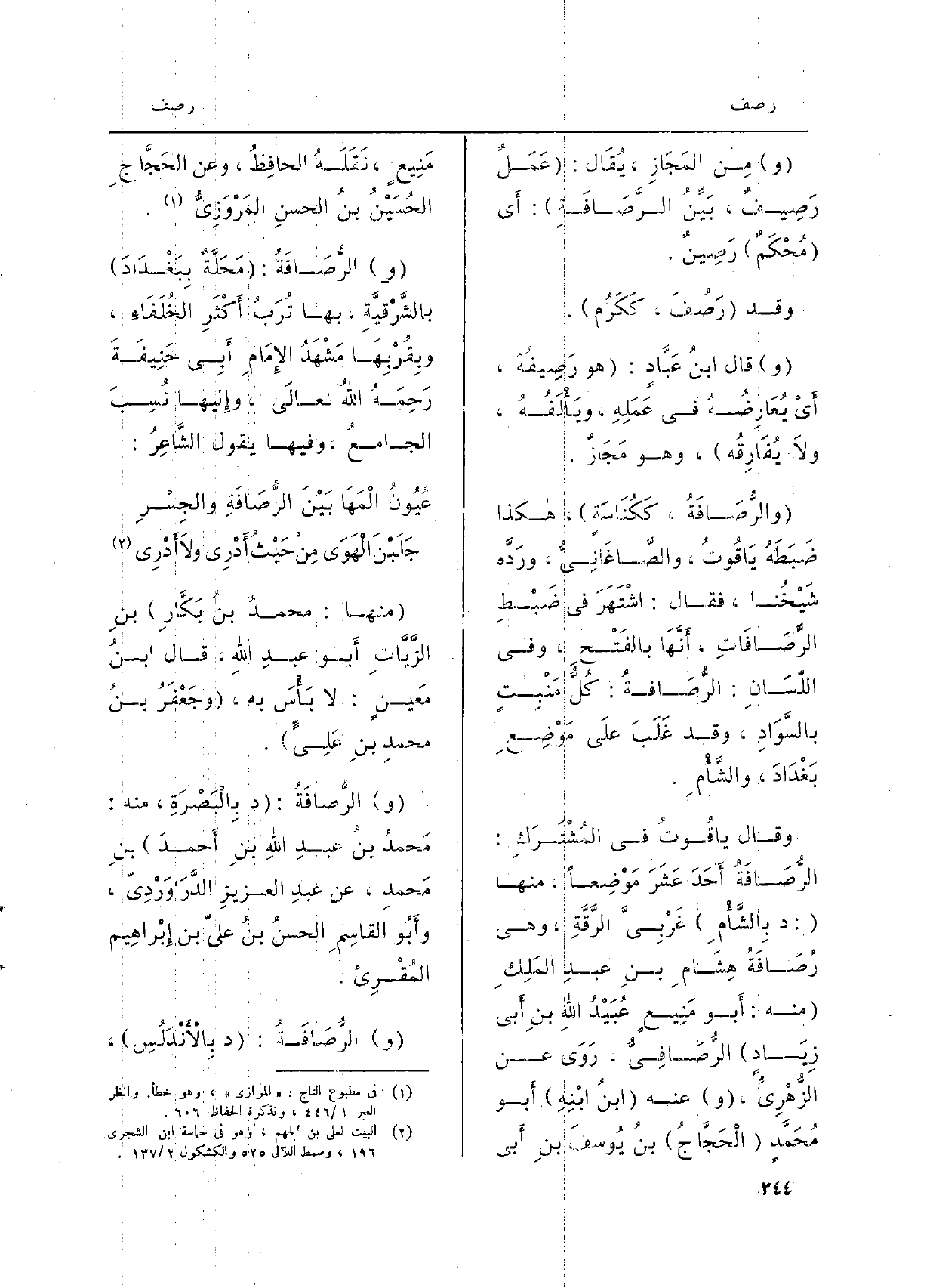 مِن المَجَازِ، يُقَال: عَمَلٌ رَصِيفٌ، بَيِّنُ الرَّصَافَةِ: أَى مُحْكَمٌ رَصِينٌ. وَقد رَصُفَ، كَكَرُم. قَالَ ابنُ عَبَّادٍ: هُوَ رَصِيفُهُ، أَيْ يُعَارِضُهُ فِي عَمَلِهِ، ويَأْلَفُهُ، ولاَ يُفَارِقُه، وَهُوَ مَجَازٌ. والرُّصَافَةُ، كَكُنَاسَةٍ، هَكَذَا ضَبَطَهُ يَاقُوتُ، والصَّاغَانِيُّ، ورَدَّه شَيْخُنا، فَقَالَ: اشْتَهَرَ فِي ضَبْطِ الرَّصَافَاتِ، أَنَّهَا بالفَتْحِ، وَفِي اللِّسَانِ: الرُّصَافةُ: كُلُّ مَنْبِتٍ بالسَّوَادِ، وَقد غَلَبَ علَى مَوْضِعِ بَغْدَادَ، والشَّأْمِ. وَقَالَ ياقُوتُ فِي المُشْتَرَكِ: الرُّصَافَةُ أَحَدَ عَشَرَ مَوْضِعاً، مِنْهَا: د بِالشَّأْمِ غَرْبِيَّ الرَّقَّةِ، وَهِي رُصَافَةُ هِشَامِ بنِ عبدِ المَلِكِ مِنْهُ: أَبو مَنِيعٍ عُبَيْدُ اللهِ بنِ أَبي زِيَادٍ الرُّصَافِيُّ، رَوَى عَن الزُّهْرِيُّ، عَنهُ ابنُ ابْنِهِ أَبو مُحَمَّدٍ الْحَجَّاجُ بنُ يُوسفَ بنِ أَبي مَنِيعٍ، نَقَلَهُ الحافِظُ، وَعَن الحَجَّاجِ الحُسَيْنُ بنُ الحسنِ المَرْوَزِيُّ. الرُّصَافَةُ: مَحَلَّةٌ بِبَغْدَادَ بالشَّرْقيَّةِ، بهَا تُرَبُ أَكْثَرِ الخُلَفَاءِ، وبِقُرْبِهَا مَشْهَدُ الإِمَامِ أَبِي حَنِيفَةَ رَحِمَهُ اللهُ تعالَى، وإِليها نُسِبَ الجامعُ، وفيهَا يَقُول الشَّاعِرُ: