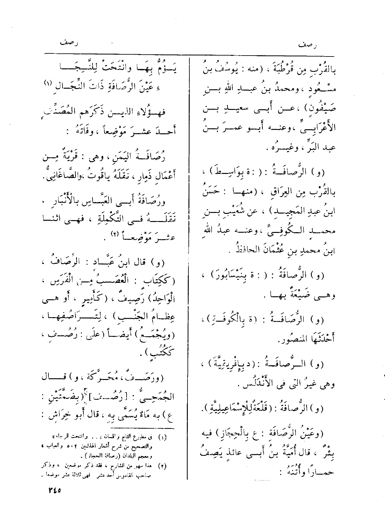 بالقُرْبِ) مِن قُرْطُبَةَ، مِنْهُ: يُوسُفُ بنُ مَسْعُودٍ، ومحمدُ بنُ عبدِ اللهِ بنِ صَيْفُونٍ، عَن أَبي سعيدِ بن الأَعْرَابِيِّ، وَعنهُ أَبو عمرَ بنُ عبد البَرِّ، وغيرُه. الرُّصافَةُ: ة بِوَاسِطَ، بالقُرْب مِن العِرَاقِ، مِنْهَا: حَسَنُ ابنُ عبدِ المَجِيدِ، عَن شُعَيْبِ بنِ محمدِ الكُوفِيِّ، وَعنهُ عبدَ اللهِ ابنُ محمدِ بنِ عُثْمَانَ الحافظُ. الرُّصافَةُ: ة بِنَيْسَابُورَ، وَهِي ضَيْعَةٌ بهاْ الرُّصَافَةُ: ة بِالْكُوفَةِ، أَحْدَثَهَا المنصُور.