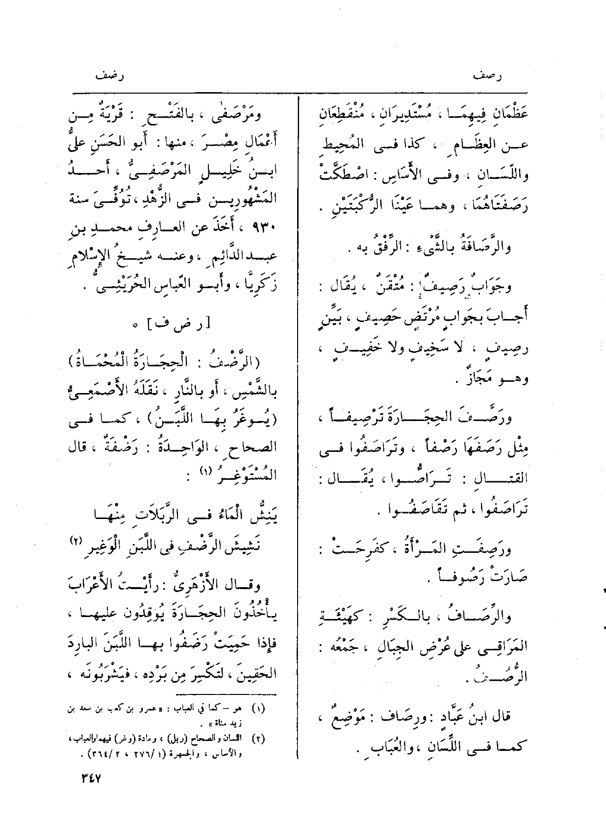 واللّسَانِ، وَفِي الأَسَاسِ: اصْطَكَّتْ رَصَفَتَاهُمَا، وهما عَيْنَا الرُّكْبَتَيْنِ. والرَّصَافَةُ بالشَّيْءِ: الرِّفْقُ بِهِ. وجَوَابٌ رَصِيفٌ: مُتْقَنٌ، يُقَال: أَجابَ بجَوابٍ مُرْتَضٍ حَصِيفٍ، بَيِّنٍ رصِيفٍ، لَا سَخِيفٍ وَلَا خَفِيفٍ، وَهُوَ مَجَازٌ. ورَصَّفَ الحِجَارَةَ تَرْصِيفاً، مِثْل رَصَفَهَا رَصْفاً، وتَرَاصَفُوا فِي القتالِ: تَرَاصُّوا، يُقَال: تَرَاصَفُوا، ثمَّ تَقَاصَفُوا. ورَصِفَتِ المَرْأَةُ، كفَرِحَتْ: صَارَتْ رَصُوفاً.