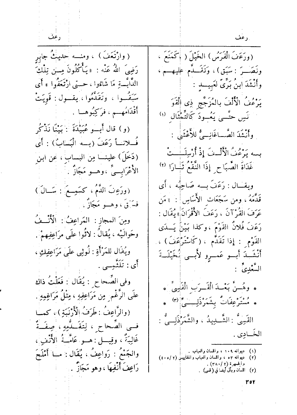 ويُقال: رَعَفَ بِهِ صَاحِبُه، أَي قَدَّمَهُ، وَمن سَجَعَاتِ الأَسَاسِ: مَن عَرَفَ القُرْآنَ، رَعَفَ الأَقْرَانَ) يُقَال: رَعَفَ فُلانٌ القَوْمَ، وَكَذَا بَيْنَ يَدَى القَوْمِ: إِذا تَقَدَّم، كَاسْتَرْعَفَ، أَنْشَدَ أَبو عَمرٍ ولأَبي نُخَيْلَةَ السَّعْدِيِّ: وهُنَّ بَعْدَ الْقَرَبِ الْقِسِيِّ مُسْتَرْعِفَاتٌ بِشَمَرْذَلِيِّ القَسِيُّ: الشَّدِيدُ، والشَّمَرْذَلِيُّ: الخَادِي. وارْتَعَفَ، وَمِنْه حديثُ جابِرٍ رَضِيَ اللهُ عَنْهُ:) يَأْكُلُونَ مِن تِلْكَ الدَّابَّةِ مَا شَاءُوا، حَتَّى ارْتَعَفُوا أَي سَبَقُوا (، وتَقَدَّمُوا، يَقُول: قَوِيَتْ أَقْدَامُهم، فرَكِبُوها. قَالَ أَبو عُبَيْدَةَ: بَيْنَا نَذْكُر فُلاناً رَعَفَ بِهِ الْبَابُ: أَي دَخَلَ علينا مِن البابِ، عَن ابنِ الأَعْرَابِيِّ، وَهُوَ مَجَازٌ. ورَعِفَ الدَّمُ، كَسَمِعَ: سَالَ فسَبٌَ، وَهُوَ مَجَازٌ. ومنَ المجازِ: المراعِفُ: الأَنْفُ وحَوالَيْه، يُقالُ: لاثُوا علَى مرَاعِفِهمْ. ويُقَال للمَرْأَةِ: لُوثِي علَى مَرَاعِفِكِ، أَي: تَلَثَّمِي. وَفِي الصِّحاحِ: يُقَال: فَعَلْتُ ذَاك علَى الرَّغْمِ مِن مَرَاعِفِهِ، مِثْلُ مَرَاغِمِهِ. والرَّاعِفُ: طَرَفُ الأَرْنَبَةِ، كَمَا فِي الصِّحاحِ، لِتَقَدُّمِهِ، صِفَةٌ غَالِبَةٌ، وقِيل: هُوَ عَامَّةُ الأَنْفِ، والجَمْعُ: رَواعِفُ، يُقَال: مَا أَمْلَحَ رَاعِفَ أَنْفِهَا، وَهُوَ مَجَازٌ.