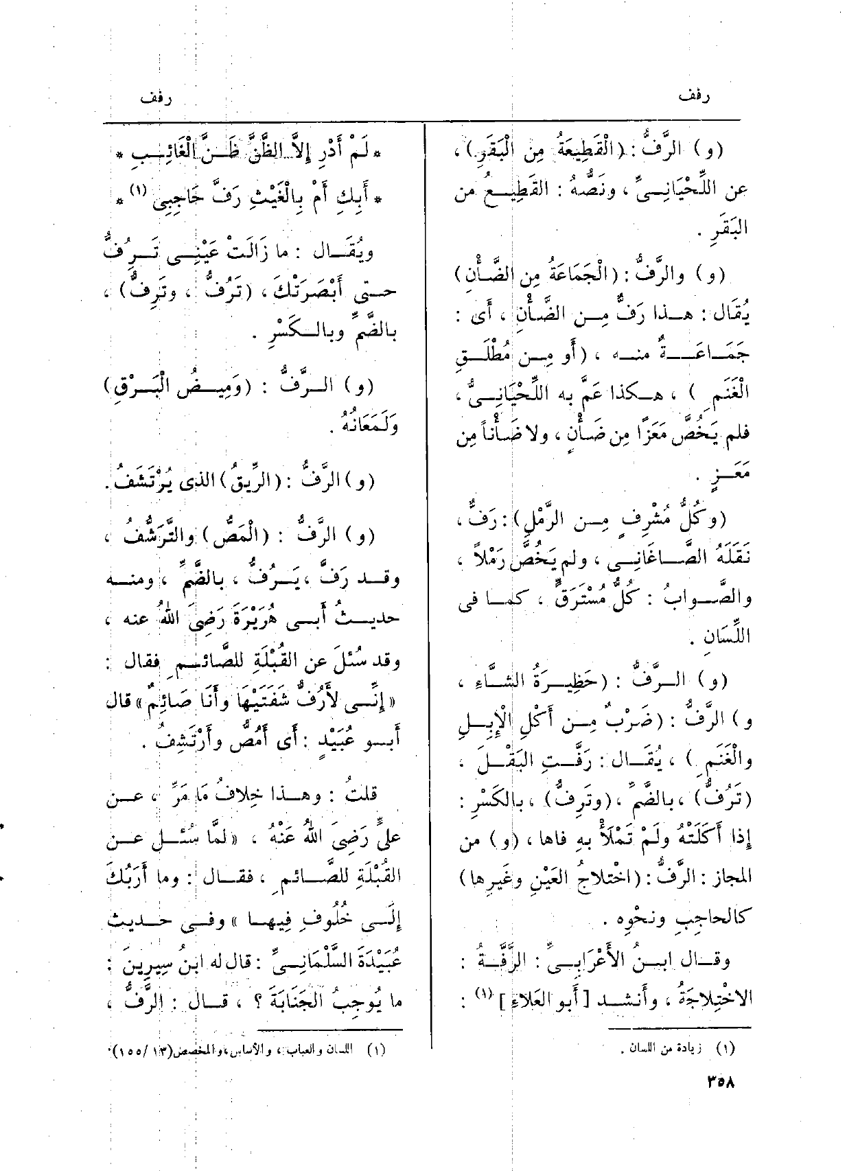 الرَّفُّ: الْقَطِيعَةُ مِن الْبَقَرِ، عَن اللِّحْيَانِيِّ، ونَصُّهُ: القَطِيعُ من البَقَرِ. والرَّفُّ: الْجَمَاعَةُ مِن الضَّأْنِ يُقَالُ: هَذَا {رَفٌّ مِن الضَّأْنِ، أَي: جَمَاعَةٌ مِنْهُ، أَو مِن مُطْلَقِ الْغَنَمِ، هَكَذَا عَمَّ بِهِ اللِّحْيَانِيُّ، فَلم يَخُصَّ مَعَزاً مِن ضَأْنٍ، وَلَا ضَأْناً مِن مَعَزٍ. وكُلُّ مُشْرِفٍ مِن الرَّمْلِ: رَفٌّ، نَقَلَهُ الصَّاغَانِي، وَلم يَخُصَّ رَمْلاً، والصَّواب: كُلُّ مُسْتَرَقٍّ، كَمَا فِي اللِّسَانِ. الرَّفُّ: حَظِيرَةُ الشَّاءِ، الرَّفُّ: ضَرْبٌ مِن أَكْلِ الإِبِلِ والْغَنَمِ، يُقَال:} رَفَّتِ البَقْلَ، {تَرُفُّ، بالضَّمِّ،} وتَرِفُّ، بالكَسْرِ: إِذا أَكَلَتْهُ لَمْ تَمْلأْ بهِ فاها، من الْمجَاز: الرَّفُّ: اخْتلاجُ العَيْنِ وغَيرِها كالحاجِبِ ونحْوِه. وَقَالَ ابنُ الأَعْرَابِيِّ: {الرَّفَّةُ: الاخْتِلاجَةُ، وأَنشد أَبو العَلاءِ: لَمْ أَدْرِ إِلاَّ الظَّنَّ ظَنَّ الْغَائِبِ أَبِكِ أَمْ بِالْغَيْثِ رَفَّ حَاجِبِي ويُقَال: مَا زَالَتْ عَيْنِي تَرُفُّ حَتَّى أَبْصَرَتْكَ، تَرُفُّ، وتَرِفُّ، بالضَّمِّ وبالكَسْرِ. الرَّفُّ: وَمِيضُ الْبَرْقِ وَلَمَعَانُهُ. الرَّفُّ: الرِّيقُ الَّذِي يُرْتَشَفُ الرَّفُّ: الْمَصُّ والتَّرَشُّفُ، وَقد رَفَّ، يَرُفُّ، بالضَّمِّ، وَمِنْه حديثُ أَبي هَرَيْرَةَ رَضِيَ اللهُ عَنهُ، وَقد سُئلَ عَن القُبْلَةِ للصَّائمِ فَقَالَ: إِنِّي} لأَرُفُّ شَفَتِيْهَا وأَنَا صَائِمٌ قَالَ أَبو عُبَيْدٍ: أَي أَمُصُّ وأَرْتَشِفُ. قلتُ: وَهَذَا خِلافُ مَا مَرَّ، عَن عليٍّ رَضِيَ اللهُ عَنْهُ، لمَّا سُئل عَن القُبْلَةِ للصَّائمِ، فَقَالَ: وَمَا أَرَبُكَ إِلَى خُلُوفِ فِيهَا وَفِي حَدِيث عُبَيْدَةَ السَّلْمَانِيِّ: قَالَ لَهُ ابنُ سِيرِينَ: مَا يُوجِبُ الجَنَابَةَ قَالَ: الرَّفّ